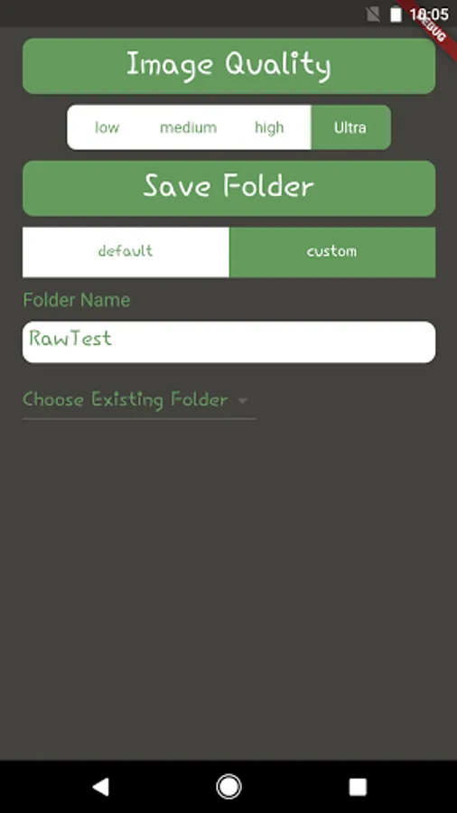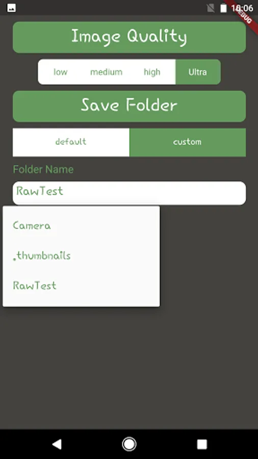 With this app you'll be able to take pictures and videos and save them directly into a folder automatically so that you can always keep your most important memories organized. Just touch the settings button and write the name of the folder where you want your media to be placed or choose a preexisting folder from the dropdown menu and that's all you have to do.