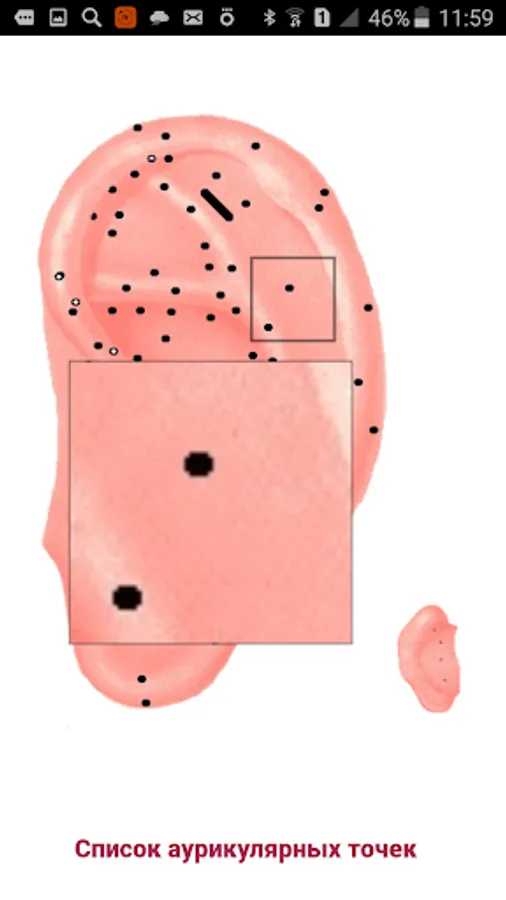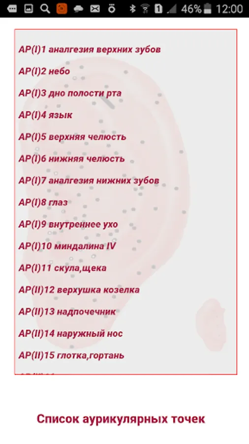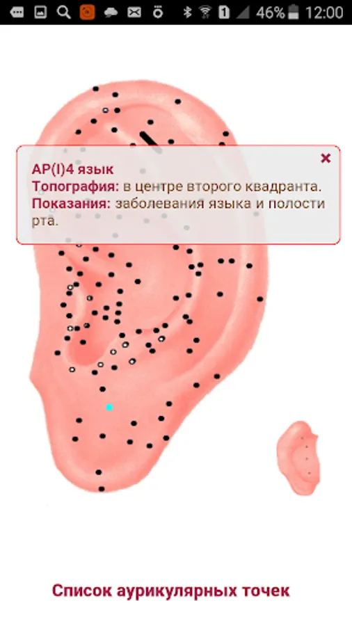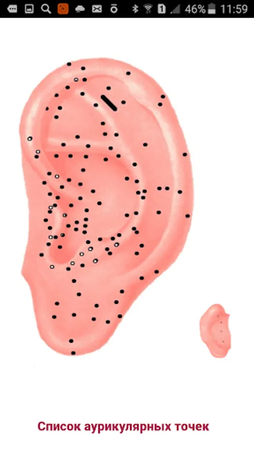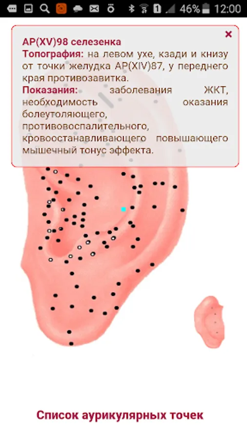 The application provides information on 110 acupuncture points of the auricle. It includes the index of the point, its name, a description of the exact location and indications for use in the treatment of diseases and pathological conditions. The point of interest is selected from the list or according to the drawing of the auricle