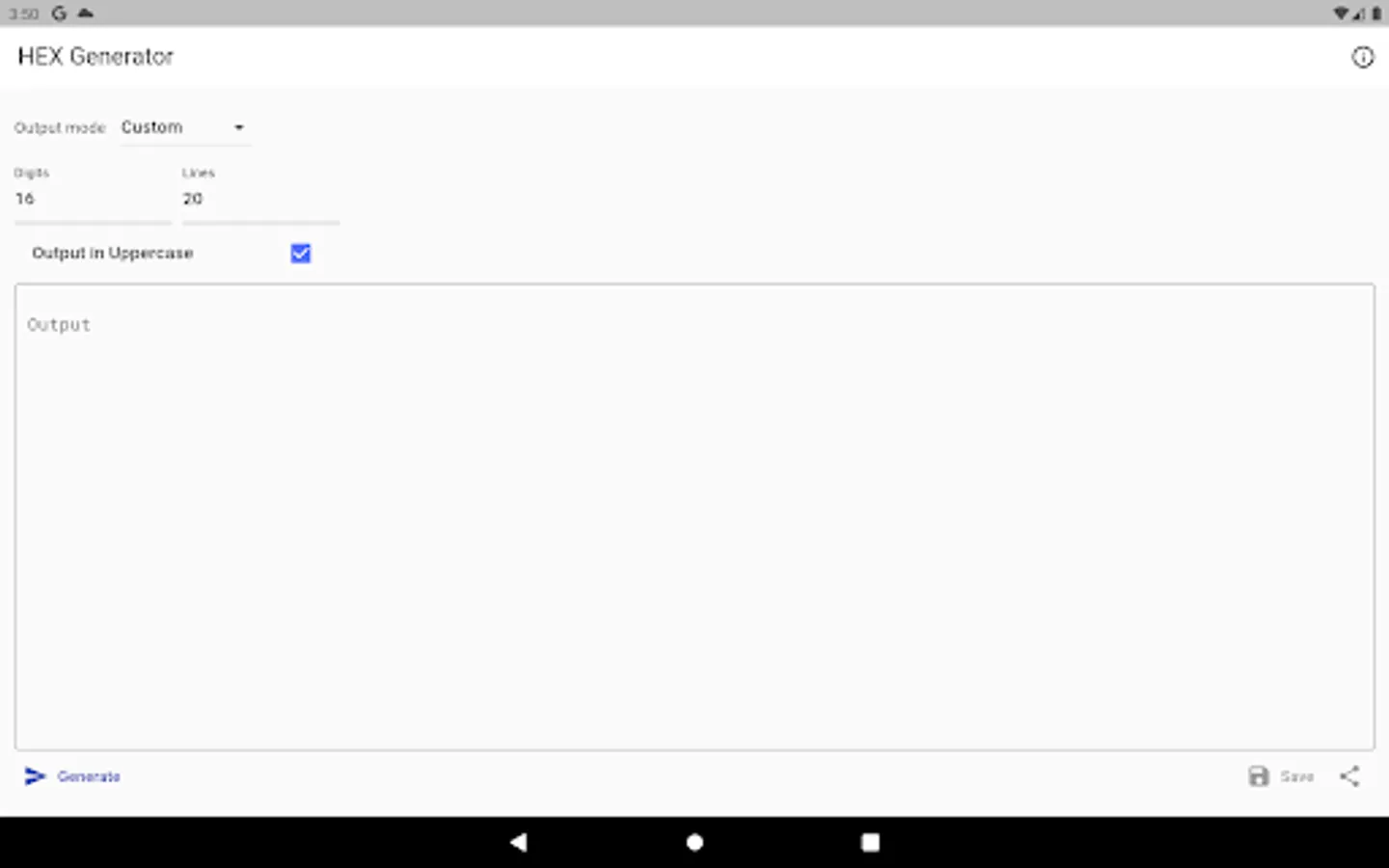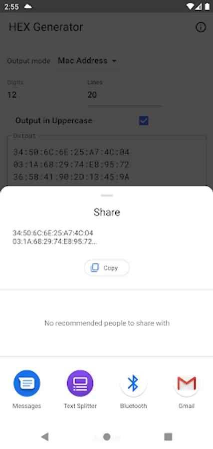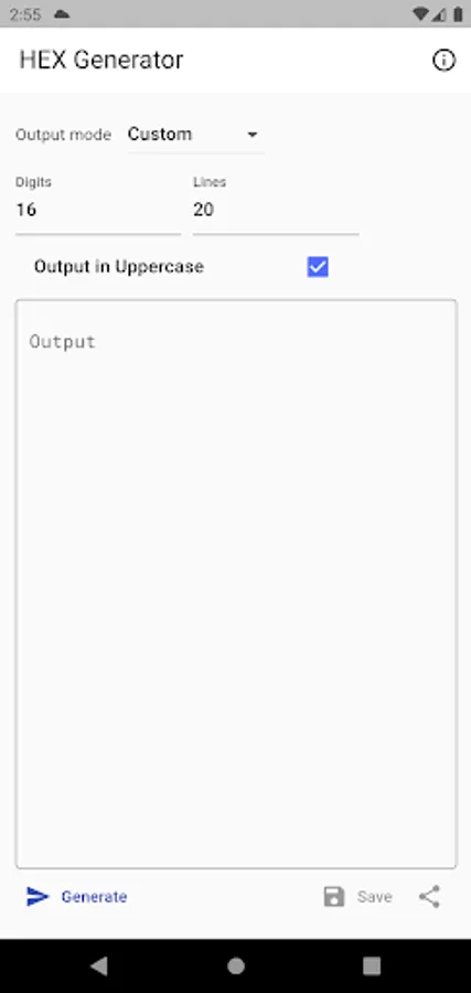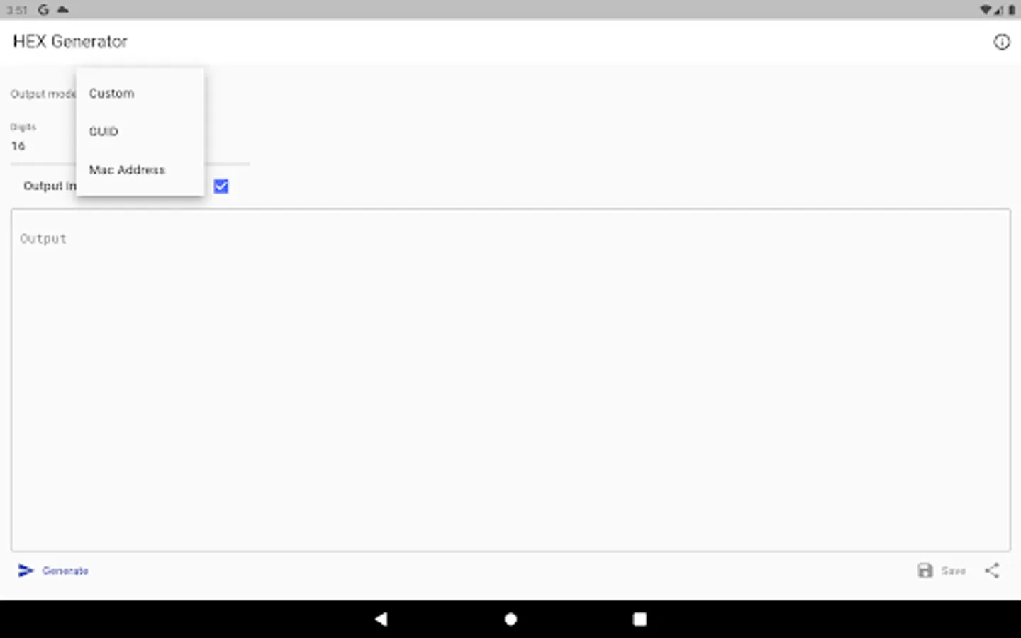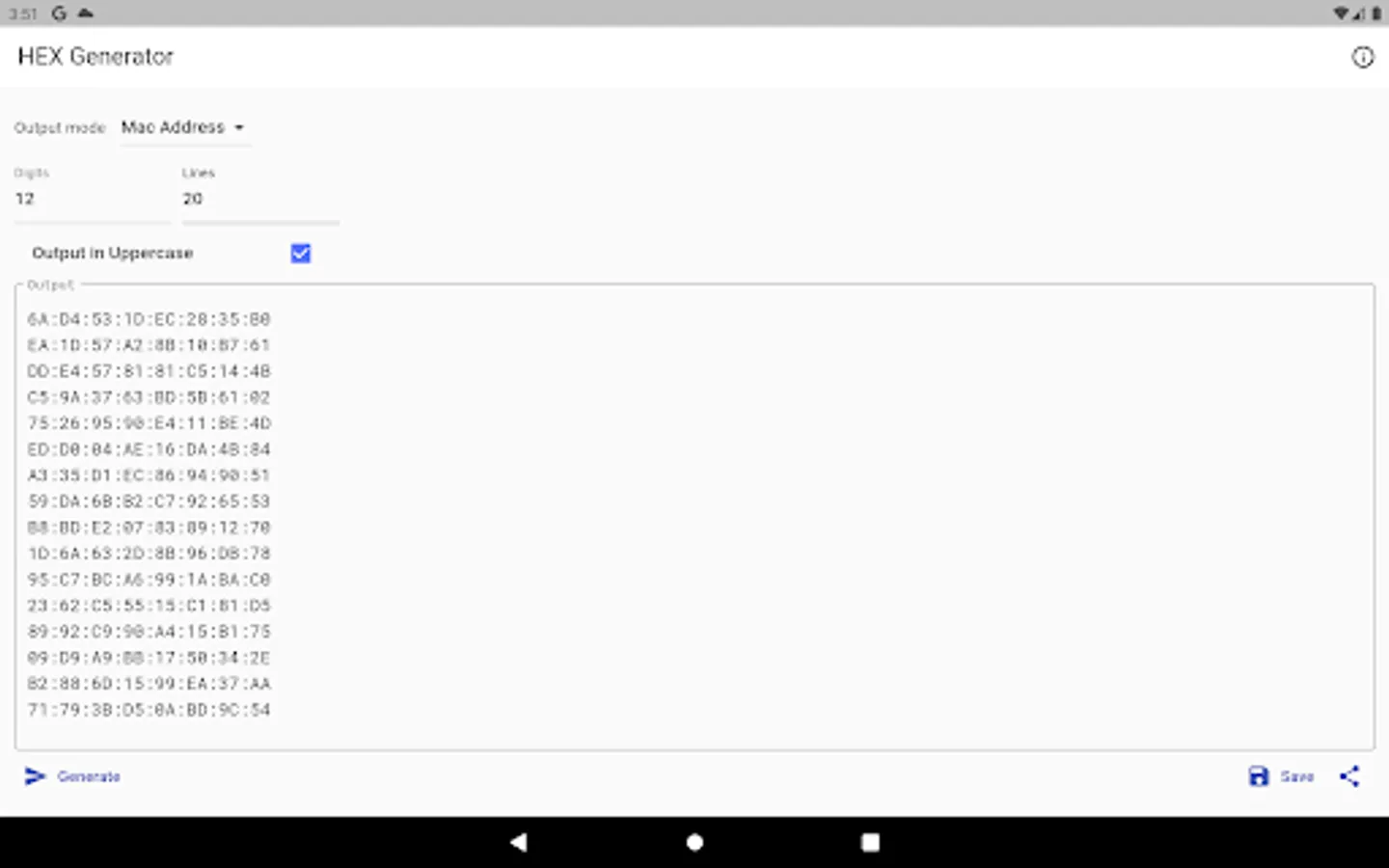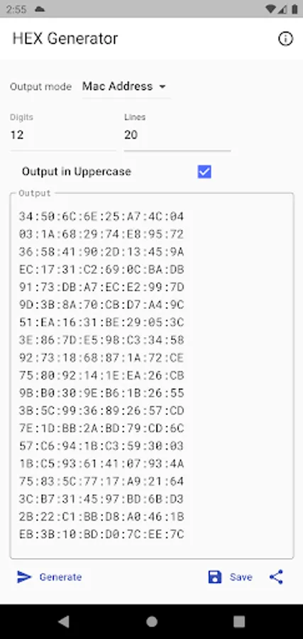 Simple hex string generator with ability to generate 3 distinct types, including MAC address and GUID. Output can be generated in lower and upper case