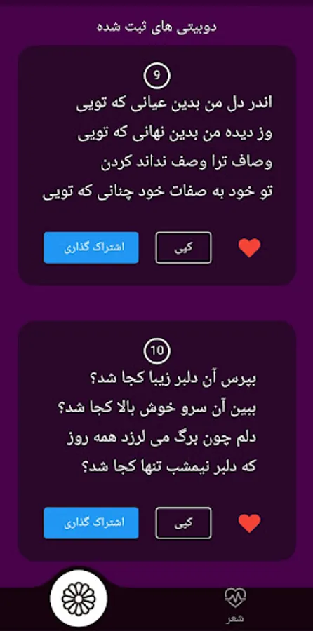 شعر و دوبیتی های زیبا از شاعران مختلف فارسی زبان با قابلیت اشتراک گذاری در شبکه های اجتماعی.