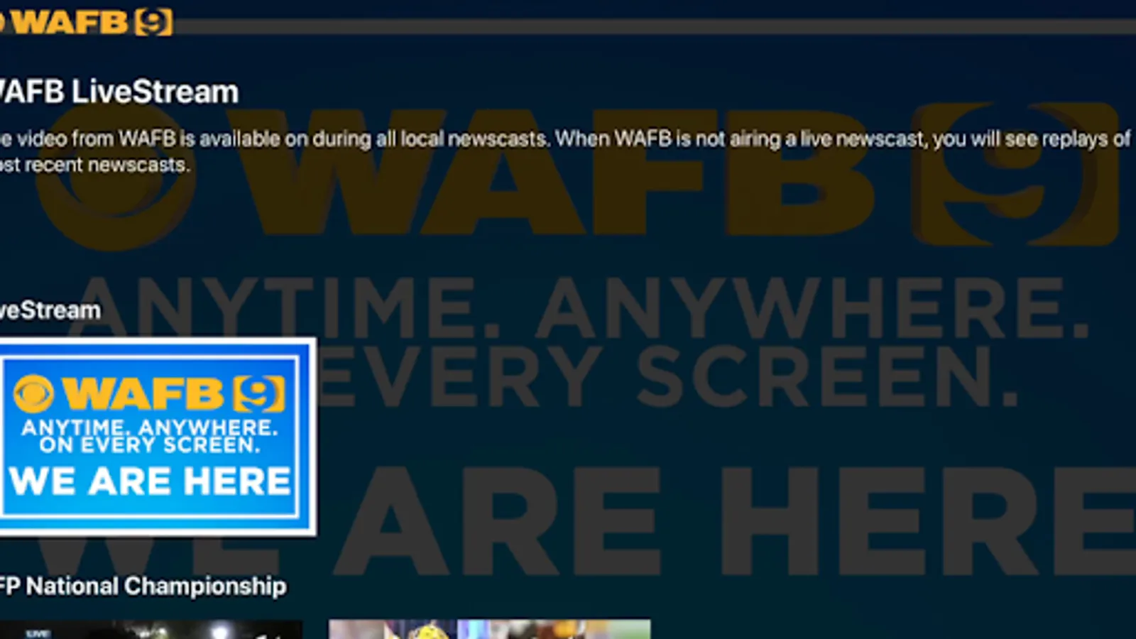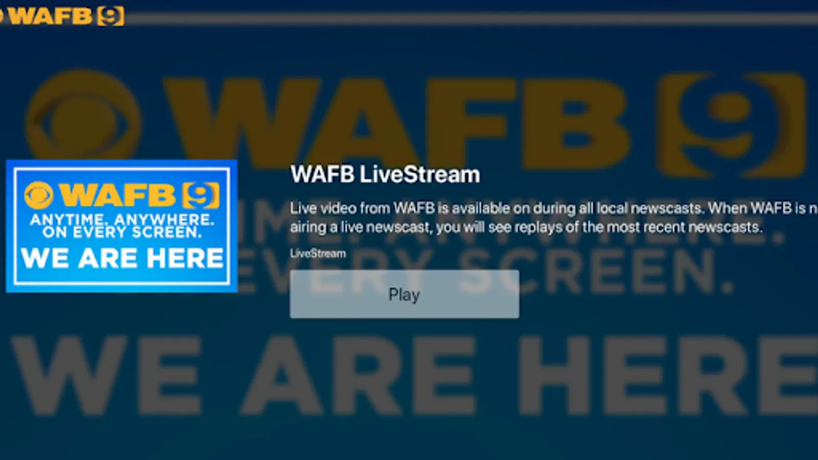 CBS (WAFB 9) affiliate also serving Assumption, Ascension, Iberville, Pointe Coupee, Wilkerson, Amite, West Feliciana, East Feliciana, St. Helena, East Baton Rouge, West Baton Rouge, Livingston, Tangipahoa, Iberia and St. Mary.