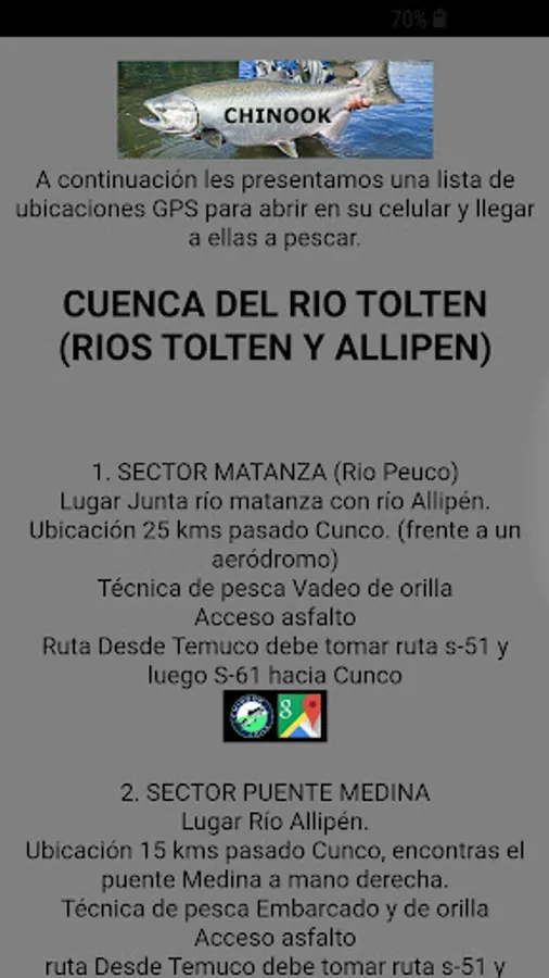 To chase the elusive and powerful King in the waters of Araucanìa and southern Chile, this application will help you with tips, lures, techniques and, most importantly, GPS coordinates of the places where the great salmon soars.
