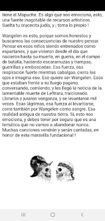 It is a content application where the author is able to deliver in a centralized and digital way the work that has occupied him for the last 15 years. Music and literature come together in this little cyber adventure. From the ax blows in my southern field on a frosty morning, to the pockets of netizens living in the internet matrix. Very well, this is an attempt to create an app to have all the wangelénic work in one place, accessible and in a minimalist way, creating an environment conducive to the blabla and also the blabla of the themes that interest us, in the humble little theater called the club of the 20 weones. I was speaking with great dignity about my music and she said to me: "Whoae, if your music will hopefully 20 weons like it." I thought of those 20 characters with great affection and that's how Chocapic was born. Wangelen is what has given meaning to our artistic life. A channel to create and express what impacts us from reality. Putting one musical note after another, until forming a song, and putting one word after another, until forming books. Libraries of knowledge and madness, interviews with death, praise to the philosophers who have given us so much, to the Chilean land, the magnetic south and all that characteristic blabla. Very good. Yes.