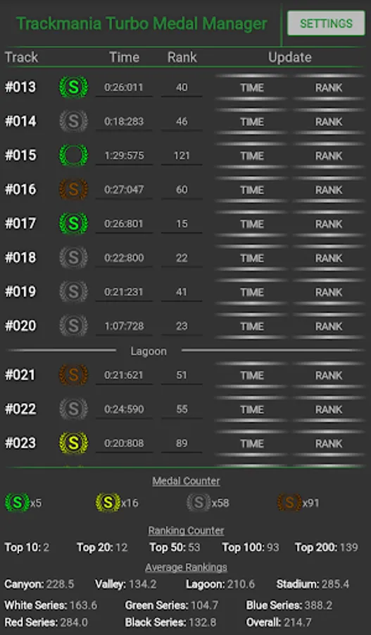 Manage your Trackmania Turbo medals, times and rankings with this app. No ads, no costs, all platforms supported.