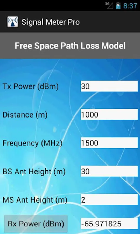 Input parameters include the transmit power, frequency, transmit-receive separation, base station antenna height and mobile station antenna height. Output parameter is the Received Signal Strength in dBm. The application is also available in Desktop version.