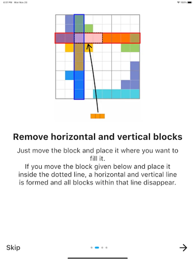 Remove blocks by filling them horizontally, vertically, and squares to score points. If you form combos, you get a high score.