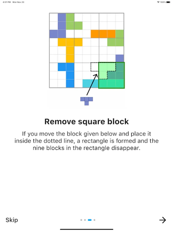 -If the given block is filled horizontally, vertically, or squarely, the block disappears and points are scored.