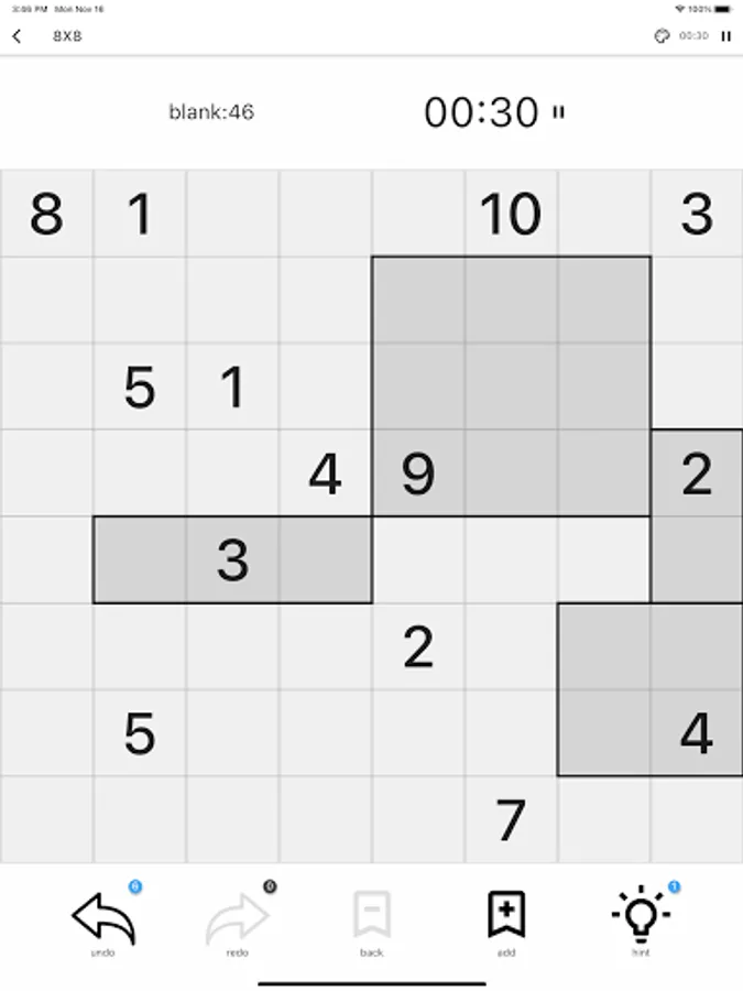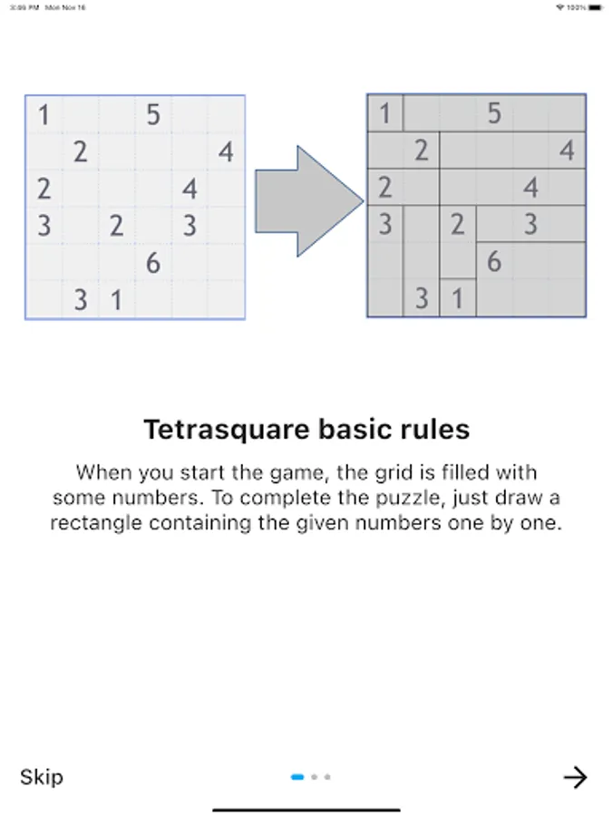 Tetrasquare is played on a rectangular grid. Some of the squares in the grid are numbered.
