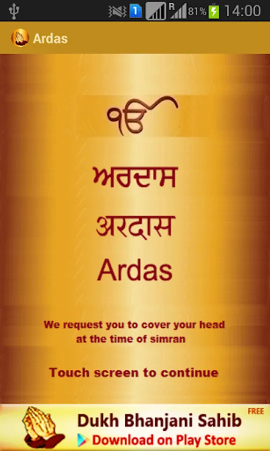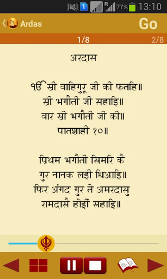 'Ardas Sahib' app let you read and listen to Sikh 'Ardaas' on your mobile. You can read 'Ardas in Hindi' or 'in Punjabi' and can read meaning while reading or listening audio on 'Ardas Sahib' app. Purpose of this app is to let busy and mobile young generation reconnect with Sikhism and Gurubani by reading path on mobile. We hope that you will find this app useful and and will use it daily.