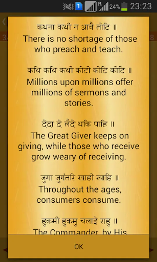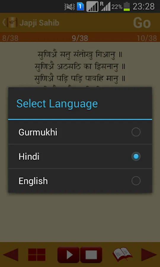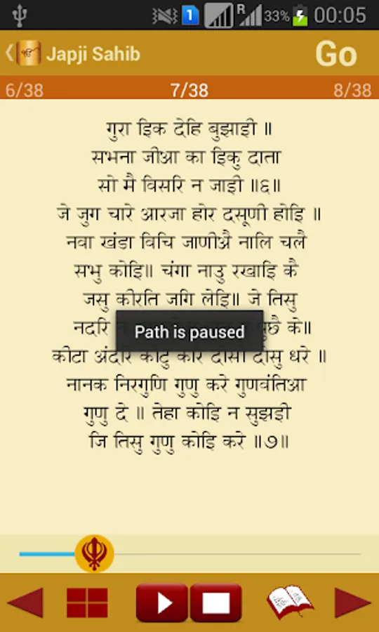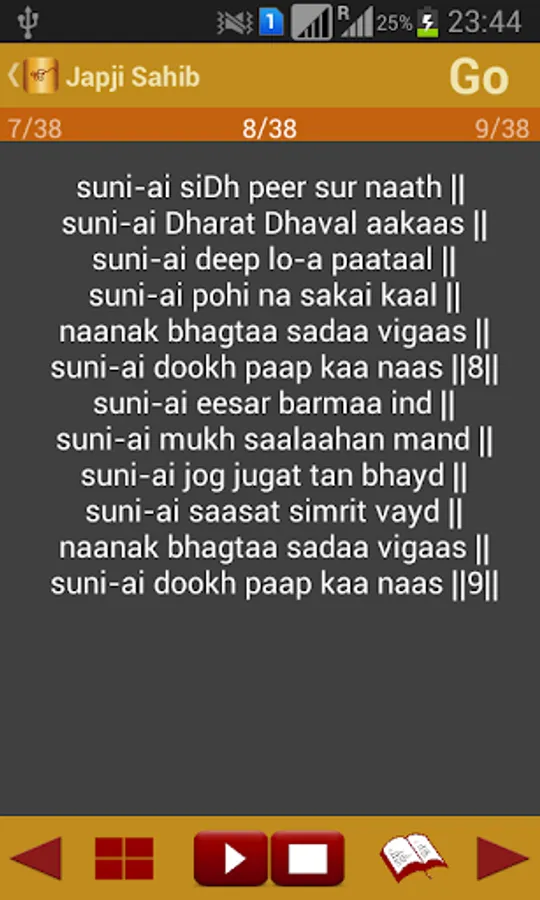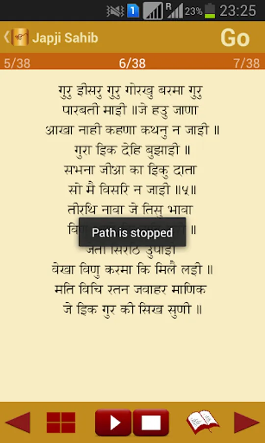 'Japji Sahib Path' app let you read and listen to 'Japji Sahib Audio' on your mobile. You can read 'Japji Sahib Path' in Hindi or Punjabi and can read meaning of path while reading or listening to 'Japji Sahib Audio'. Purpose of this app is to let busy and mobile young generation reconnect with Sikhism and Gurubani by reading path on mobile. We hope that you will find this app useful and and will use it daily.