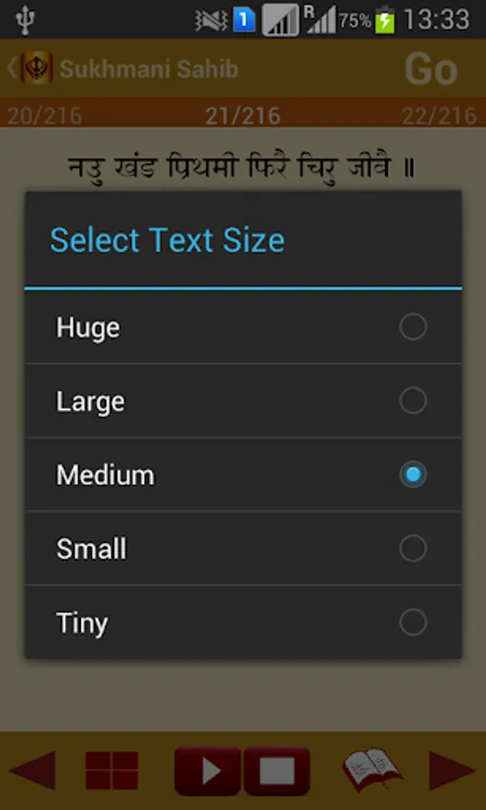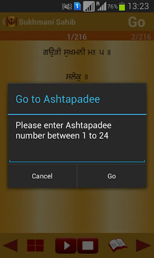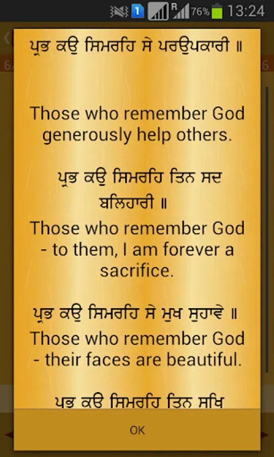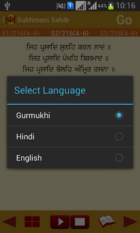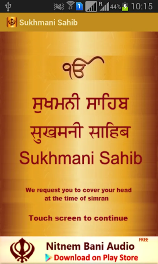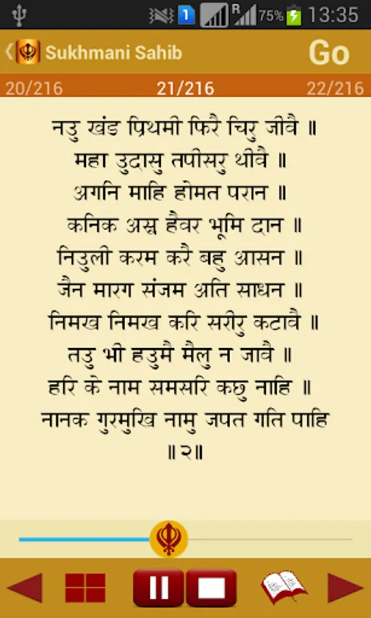 'Sukhmani Sahib Audio' path app let you read and listen to paath on your mobile. You can read 'Sukhmani Sahib Path' 'in Hindi'', 'in Punjabi' or 'in English' and can read 'meaning of path' while reading or listening to 'Sukhmani Sahib Path'. Purpose of this app is to let busy and mobile young generation reconnect with Sikhism and Gurubani by reading path on mobile. We hope that you will find this app useful and and will use it daily.