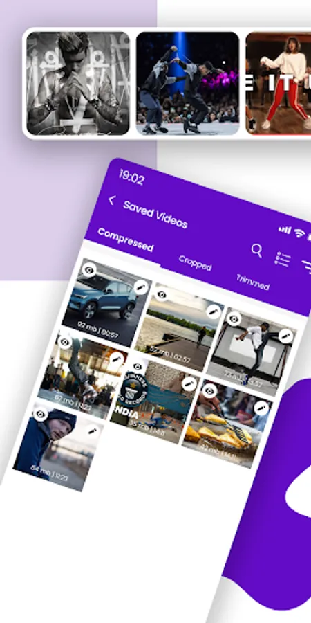 Once your videos is compressed or edited you can view it in mini or full screen. Alternatively, compare it with the original one or with the trimmed or cropped version. Easily view your saved videos in separate section. Then share them easily on Instagram, Facebook, Whatsapp or anywhere you desire with 1 tap.
