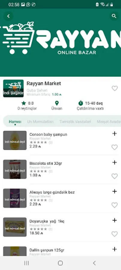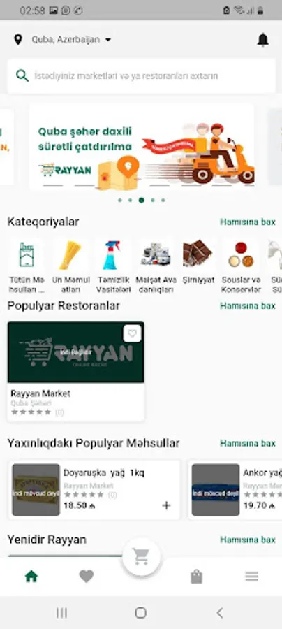 "Rayyan" is an online supermarket operating in Azerbaijan. You can order food, groceries or other products by downloading "Rayyan" application. By downloading the mobile application, you can order thousands of products at your doorstep 24/7 with one touch. No more waiting in long queues at stores, order from Rayyan and we will deliver to your doorstep as soon as possible.
