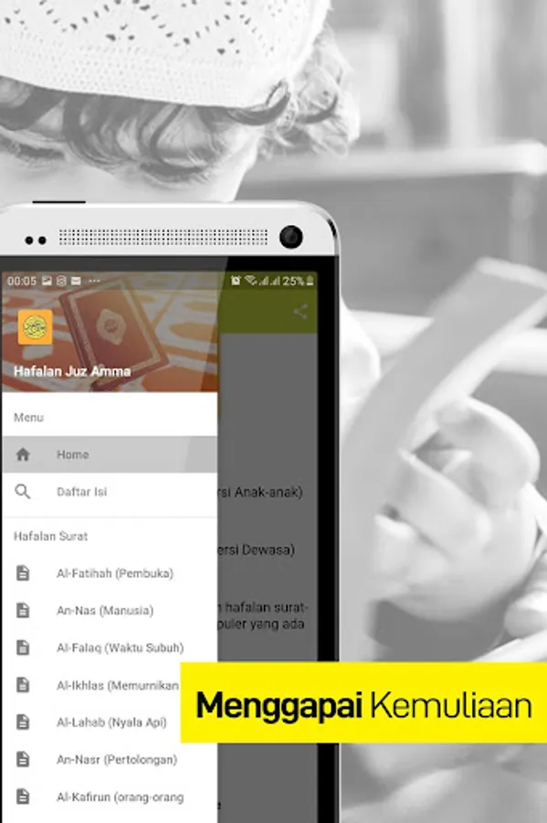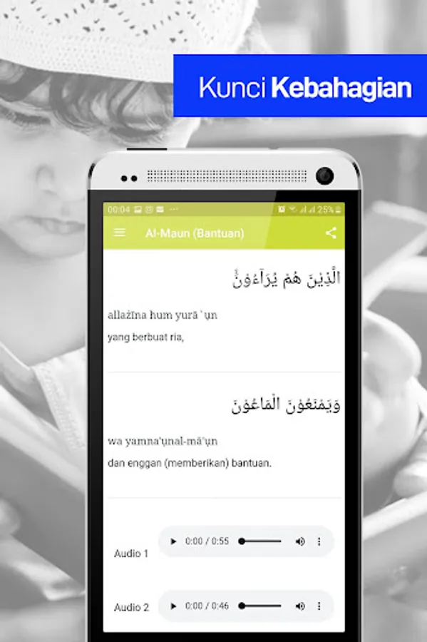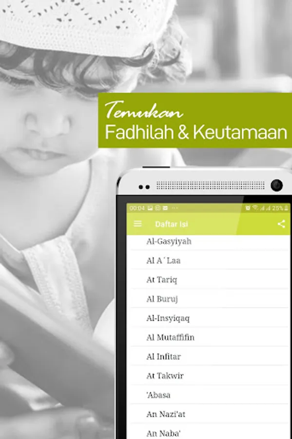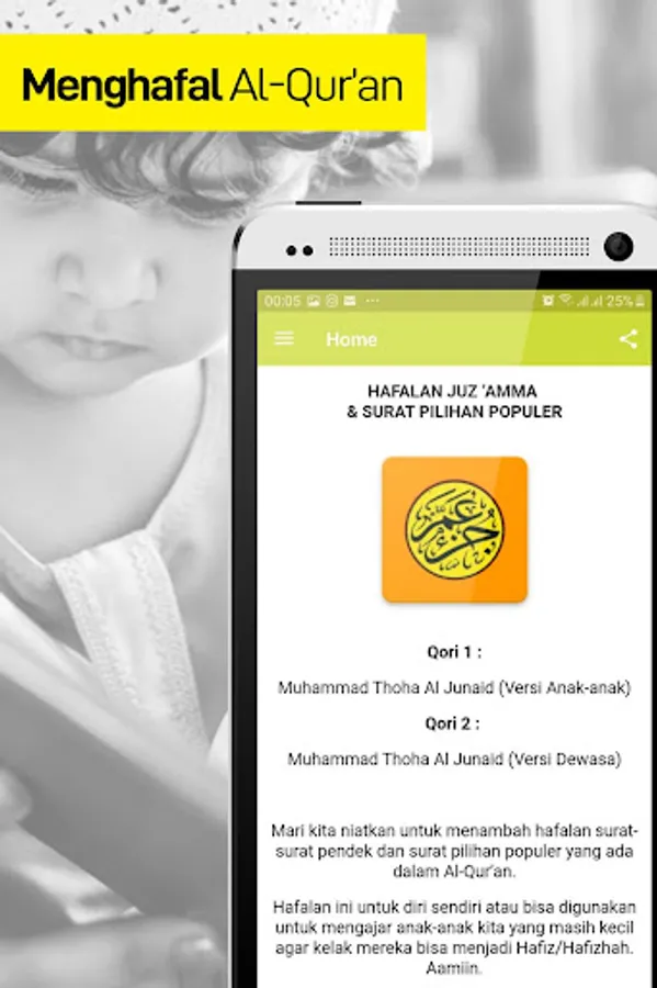 This application is suitable for children and adults, even parents. Does not burden your smartphone, has a clean appearance, clear letters, is equipped with Latin writing (for those who cannot read Arabic), and is equipped with audio sounds from the well-known Qori, Shaykh Muhammad Thoha (children's and adult versions).