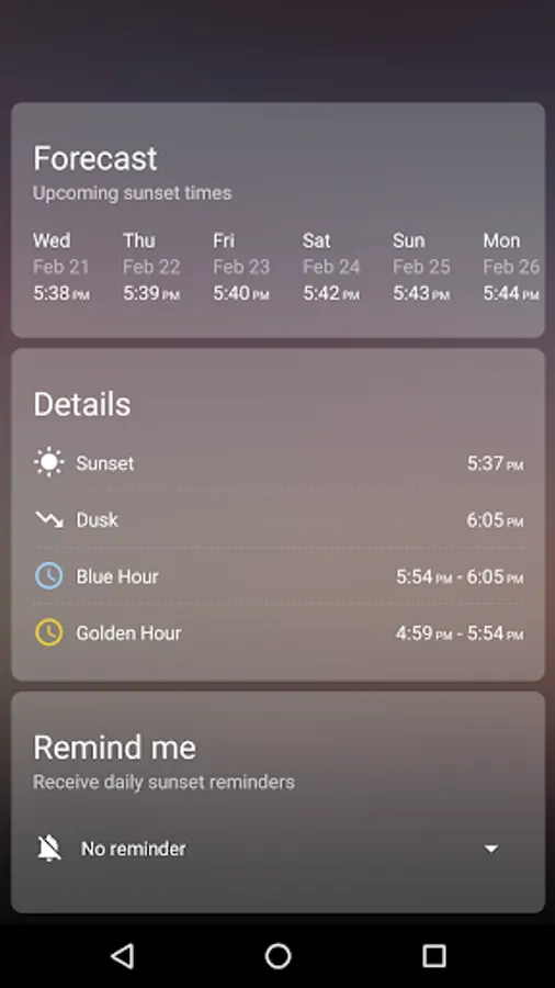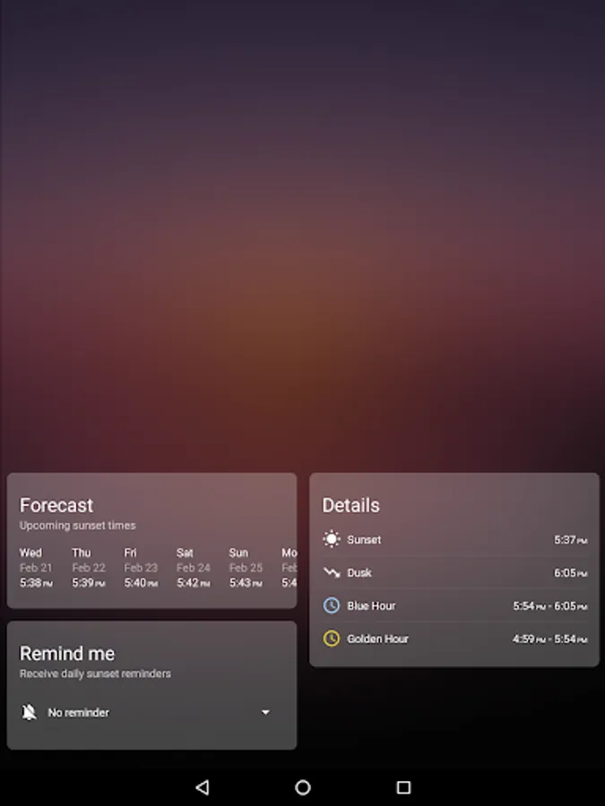 • Get times for dawn, dusk, blue hour, and golden hour for your location.