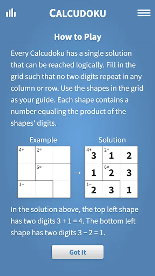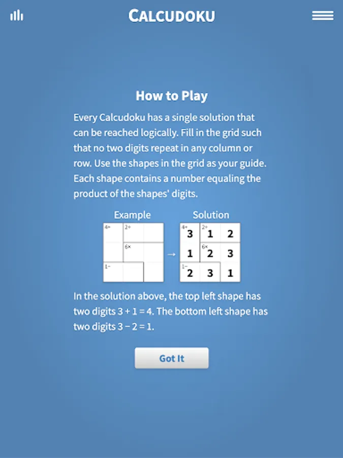 Every Calcudoku has a single solution that can be reached logically. Like Sudoku, fill in the grid such that no two digits repeat in any column or row. Use the shapes in the grid as your guide. Each shape contains a number equaling the product of the shapes' digits. For example a shape with three cells containing the number 6 may have cell values 1, 2 and 3, as 1 × 2 × 3 = 6. Challenge yourself further with larger grids for experts, up to 9x9 size!