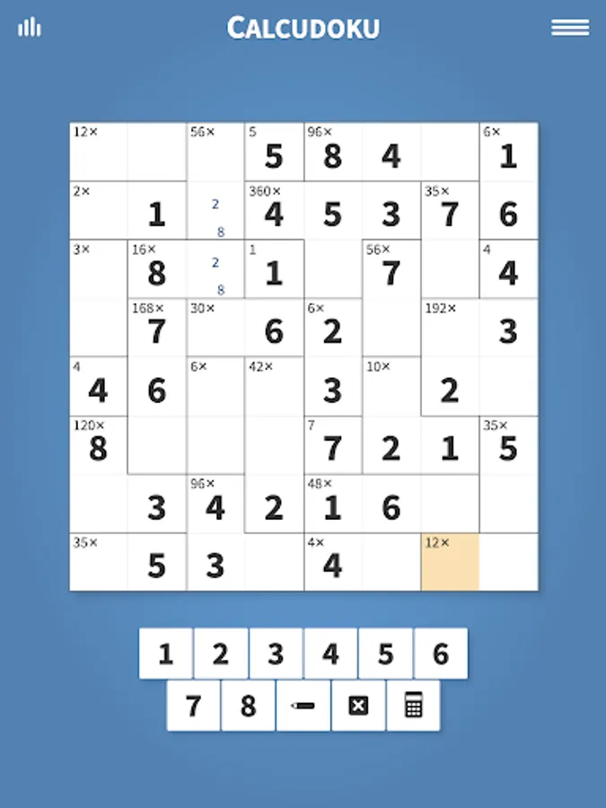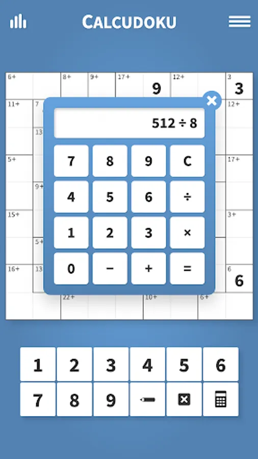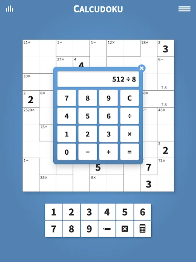 Calcudoku offers thousands of fun math puzzles with features to help you solve each puzzle. Enjoy an unlimited number of hints and checks in case you get stuck. Use the calculator tool to help with multiplication and division against large numbers. And rest assured that all puzzle games are automatically saved and restored letting you stop and restart games with ease.