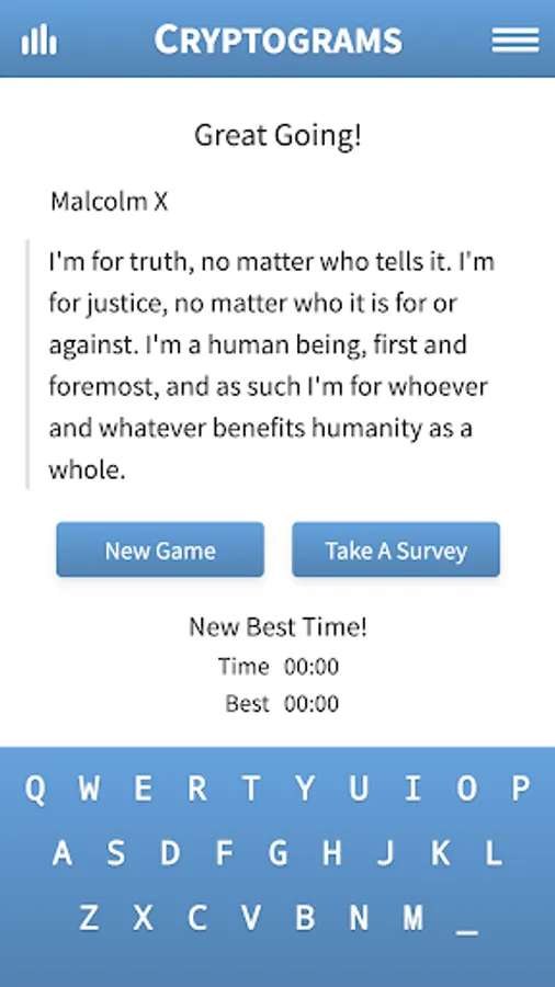 A cryptogram is an encoded statement that requires a degree of strategy to decode. The cryptograms found in this puzzle game use a 1-to-1 substitution cipher. For example all of the letter N’s in a cryptogram might stand for the letter B in the decrypted statement. Aside from letters nothing else in the statement has been changed, e.g. spacing and punctuation. In the case of this puzzle game all statements are quotes from relatively famous to very famous individuals. Using your knowledge of the English language and grammar, see if you can decrypt the quote!