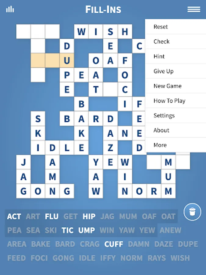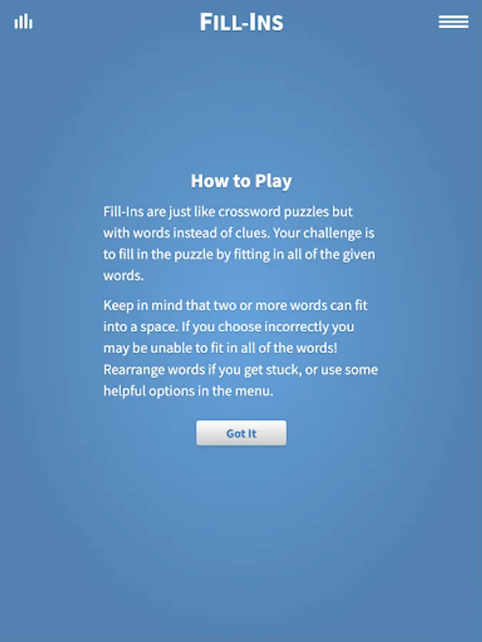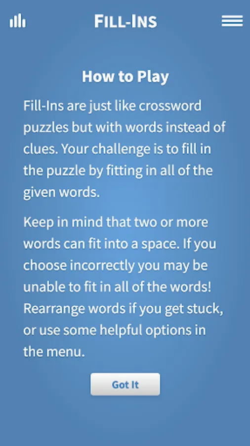 Enjoy Fill-Ins, our classic puzzle game with thousands of fun to play word fit crossword puzzles. If you like crossword puzzles, you will love fill in puzzles! A great mind exercise!