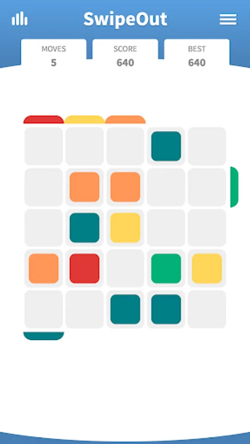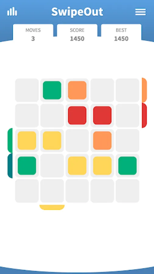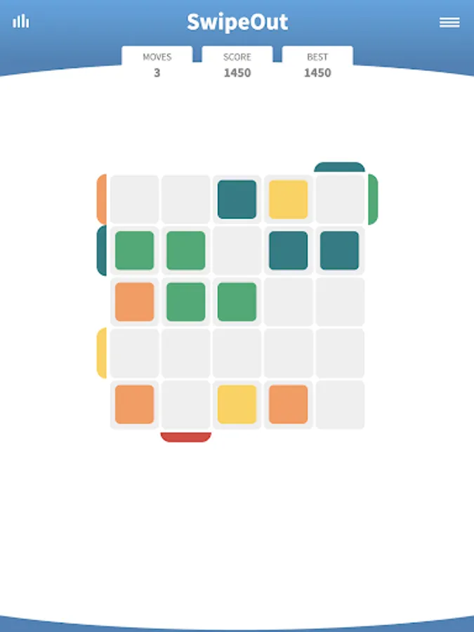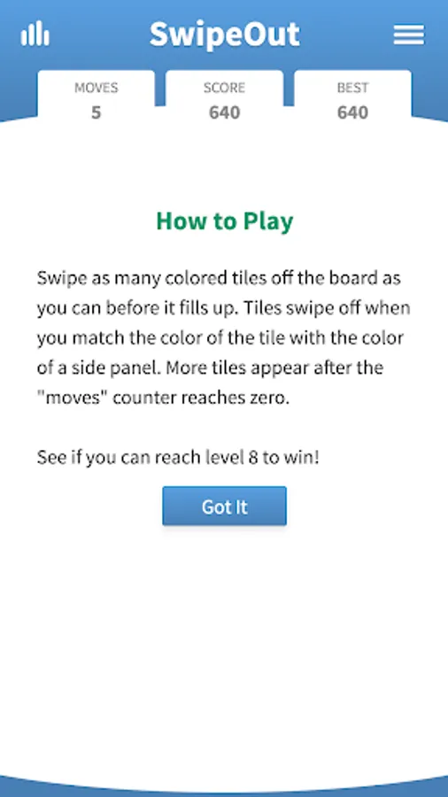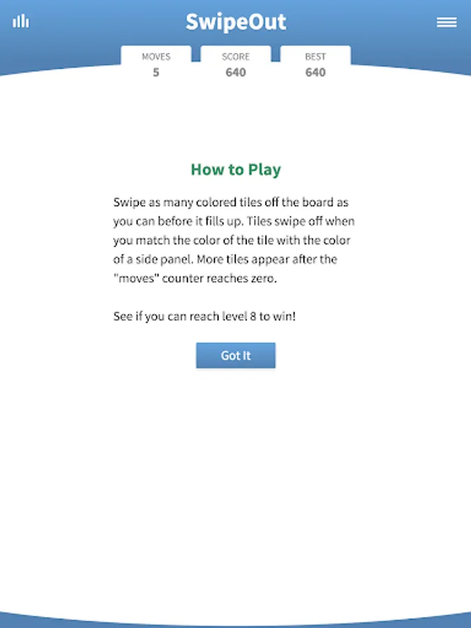 The goal is to swipe off as many colored tiles as you can from the board. Colored tiles can only be swiped off through their same colored side panels. More tiles appear after the moves counter reaches zero so be mindful and strategic with your swipes. Each time you swipe a tile off the board your points go up. The higher your score, the harder it gets! Hone your strategy and keep the game going for as long as you can to increase and maximize your score. See if you can reach level 8 to win!