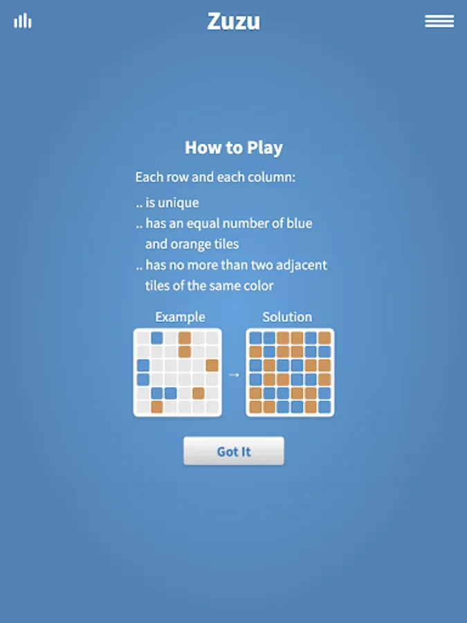 Enjoy Zuzu, a binary puzzle game that tests your logic and skill! If you like Sudoku puzzles, you will love Zuzu!