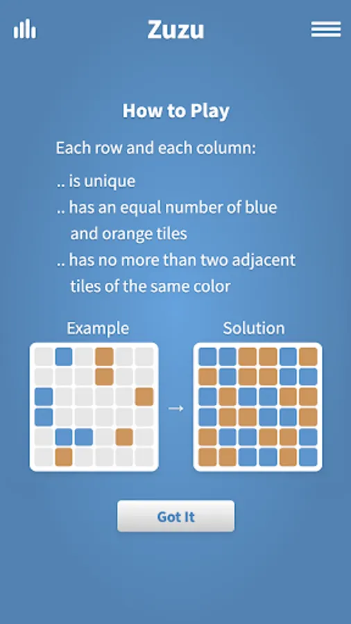 Your goal is to fill in the board using only logical determination, similar to Sudoku. Tap a tile on the board to set or change its color. Like the binary number system in general, there are only two tile colors, red (0) and blue (1). Zuzu games begin with an unfinished grid that must be filled in correctly according to three rules listed below.