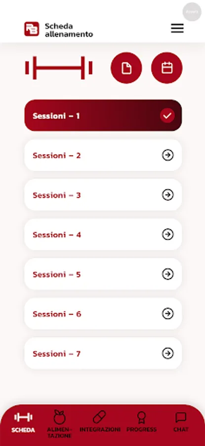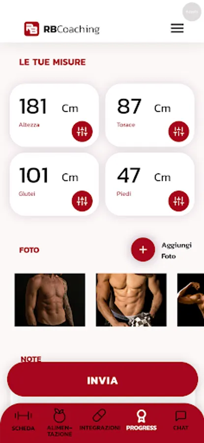 The RBCoaching application allows thanks to its simplicity to be used by all types of people, newbies and not with digital. In fact, this tool is a service that allows users to manage their own personalized plan directly from their mobile phone, being able to consult the programming at any time, mark loads, see their physical progress and even communicate with me directly. Everything remains 100% personalized to each individual user with a plan designed by me and thanks to the digital experience it will be 10 times more advanced, precise and familiar. In fact, the app is made up of 5 macro categories: TRAINING / DIET / INTEGRATION / PROJECTS / CHAT.