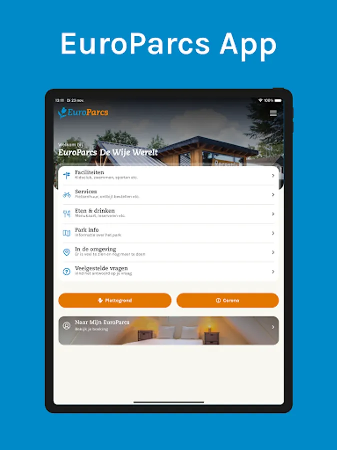 Met de vernieuwde EuroParcs app heb je alles wat je nodig hebt tijdens je verblijf bij EuroParcs op je telefoon of tablet. Kies in de app jouw vakantiepark en vind hierin alle informatie over de faciliteiten, de leukste uitstapjes, alle openingstijden, het animatieprogramma en nog veel meer. Je kunt in de app zelfs reserveren voor bijvoorbeeld het restaurant of het zwembad. Fijne vakantie!