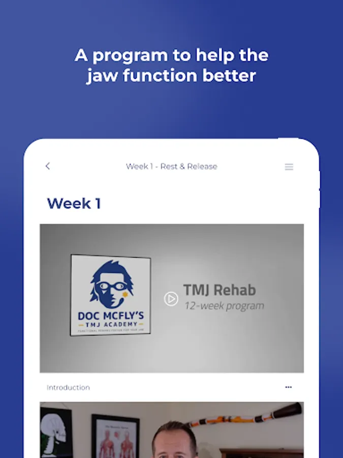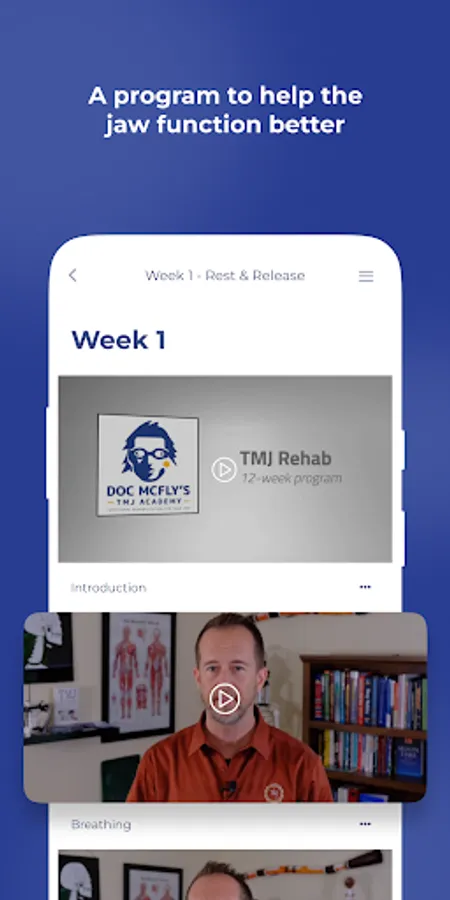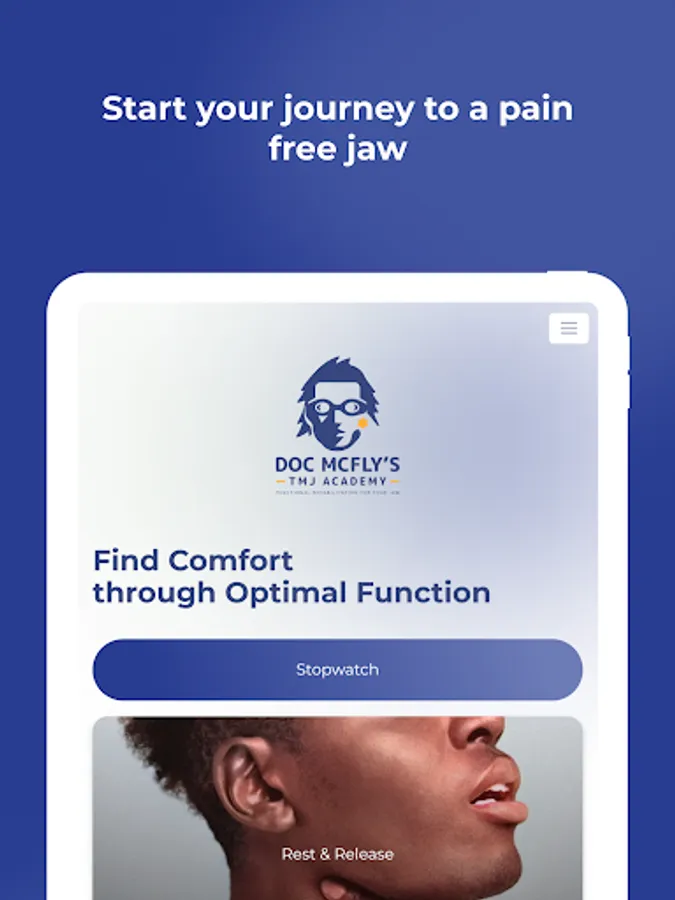 This app will guide users through a 12-week program to help them improve the function of the jaw. The target audience is people who are having pain, or clicking, or locking of the jaw, as well as sleep apnea. There are many videos which demonstrate the recommended exercises, in the recommended order.