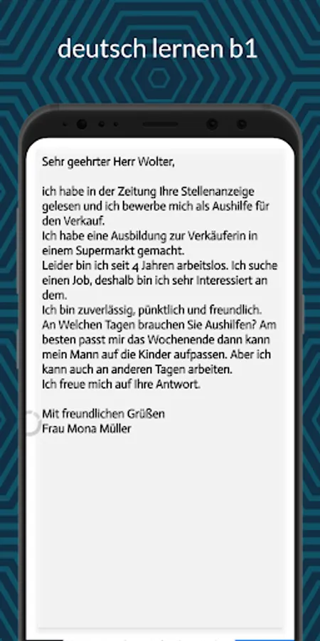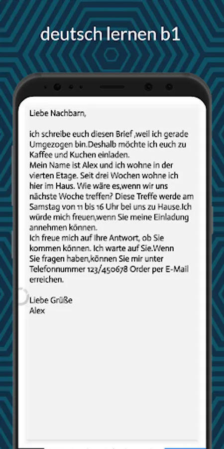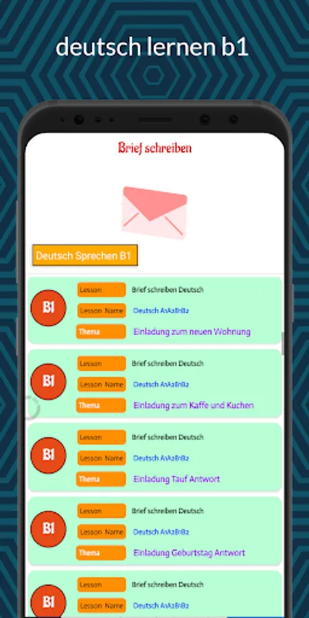 deutsch lernen b1 ist eine sehr einfache App für Ihre Prüfung b1 in Deutsch. Mit Hilfe dieser Anwendung Deutsch Lernen b1 ist es ganz einfach, einen Brief für die A1-Prüfung zu schreiben. Sie können einen formellen Brief, Schul- oder Hochschulbriefe, persönliche Briefe, offizielle Briefe und so weiter schreiben. Hier finden Sie Deutschprüfungen für das Sprachniveau Deutsch B1. Hier finden Sie Deutschprüfungen für das Sprachniveau Deutsch A1.