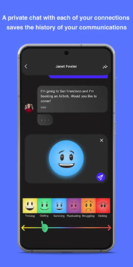 Connect with anyone who is in your phone: friends, children, parents, extended family members, doctors, patients, teachers, students, coworkers, managers, and more, using this #SameHere Scale App. You are easily able to both request and share how you are doing with anyone you choose, using the same language on this “Scale” - daily, weekly, monthly, and engage in private, secured chats related to those responses. You can even choose to record and comment or journal about your journal about your own Scale responses, so that you may notice your own trends over time. As you discover what actions/behaviors/exercises/therapies move you further to the left, towards "Thriving" more consistently on the Scale, you can stick with those routines, and help others you are connected with, do the same!