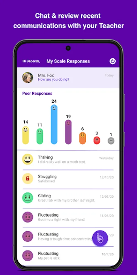 Connect with your teacher or school mental health professional using this #SameHere Scale App. You will be able to share your responses with your teacher and/or your school professionals, at their request - daily, weekly, monthly, and engage in private, secured chats related to those responses. No other students will be able to view your responses or communications.