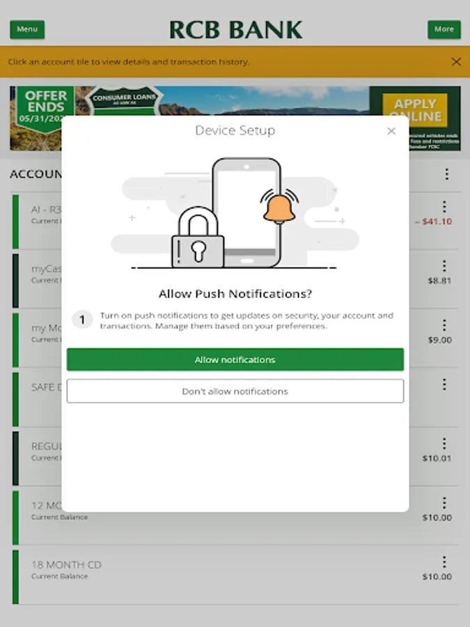 RCB Bank's mobile banking app is a money management tool in the palm of your hand. Our app allows you to access your accounts using your existing RCB Bank Online Banking username and password.