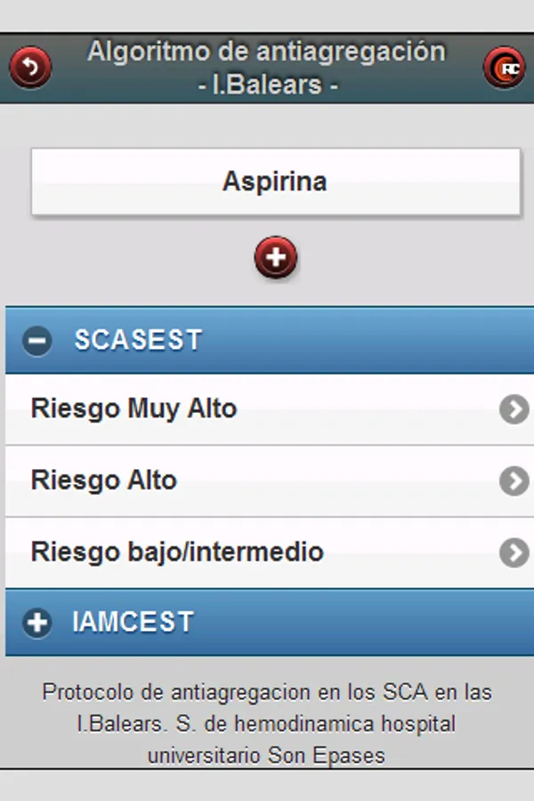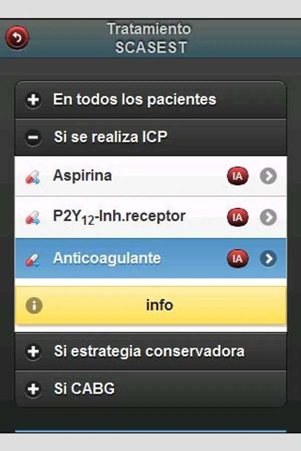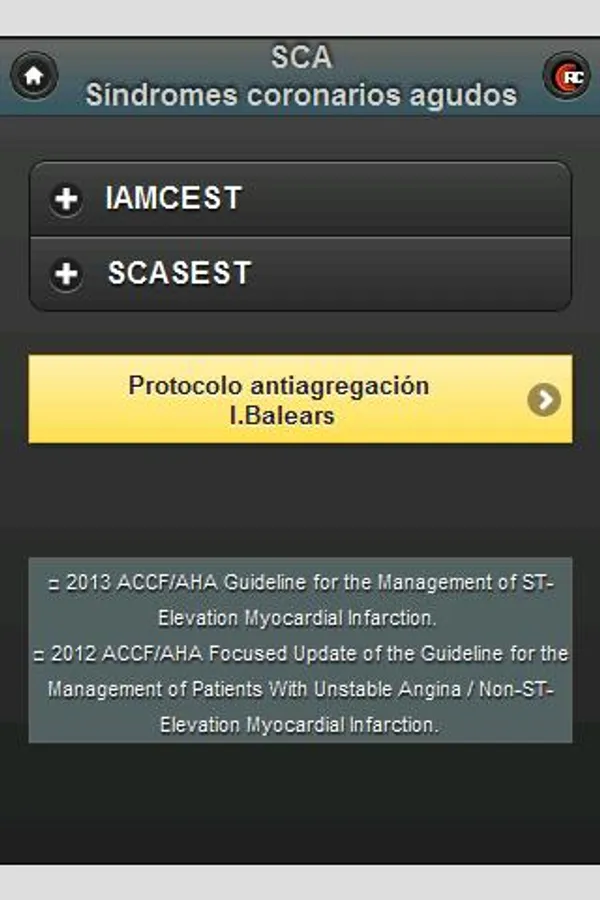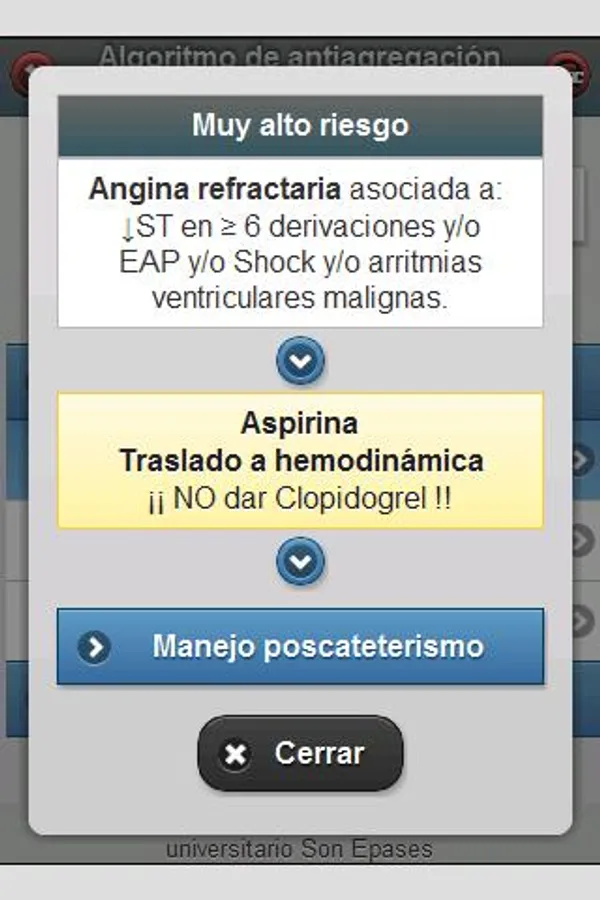 Updated treatment of acute coronary syndromes following guidelines ACCF / AHA and SEC (2013 STEMI / NSTEMI 2014). Contains the algorithm used in the Balearic Islands for managing antiplatelet therapy and calculators for risk stratification (TIMI, CRUSADE, GRACE).