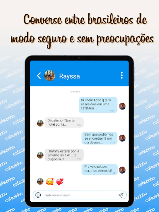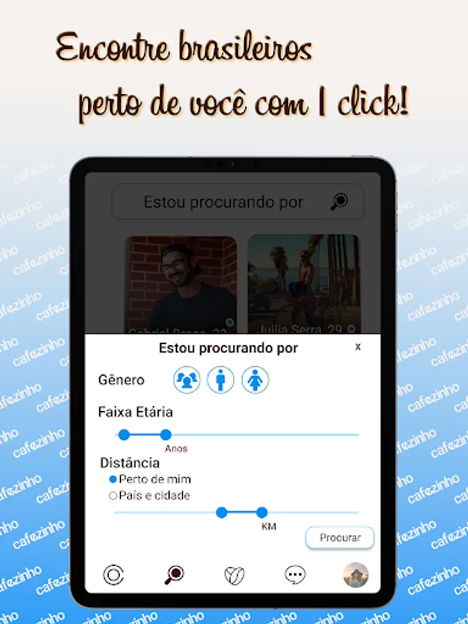 Cafezinho's main objective is to be a reliable application, in which its users can find other Brazilians who want something that goes far beyond casual. With its simple, clean, intuitive and visually pleasing platform, this App aims to facilitate the meeting of Brazilians who have left their homeland, as there is nothing compared to the connection between us: Brazilians.
