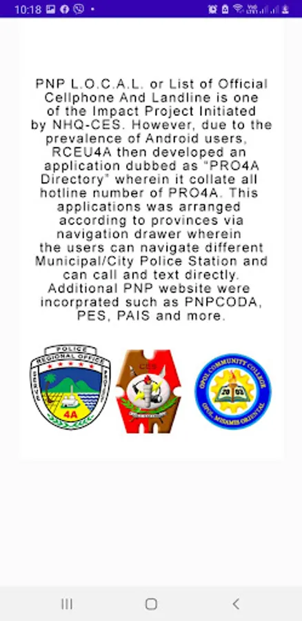 The Project List of official Cellphone And Landline (LOCAL) apps were develop to have an ease with the users and can seek help in an instant if need assistance. it is a list of different hotline numbers from different unit/offices in the pnp of pro4a