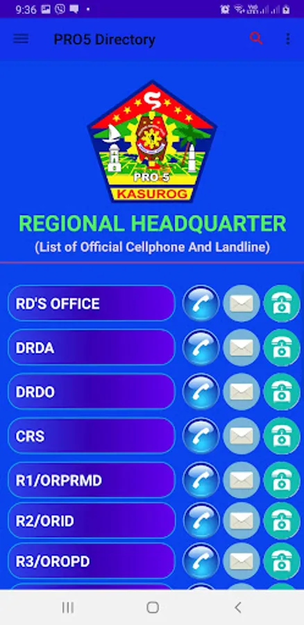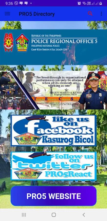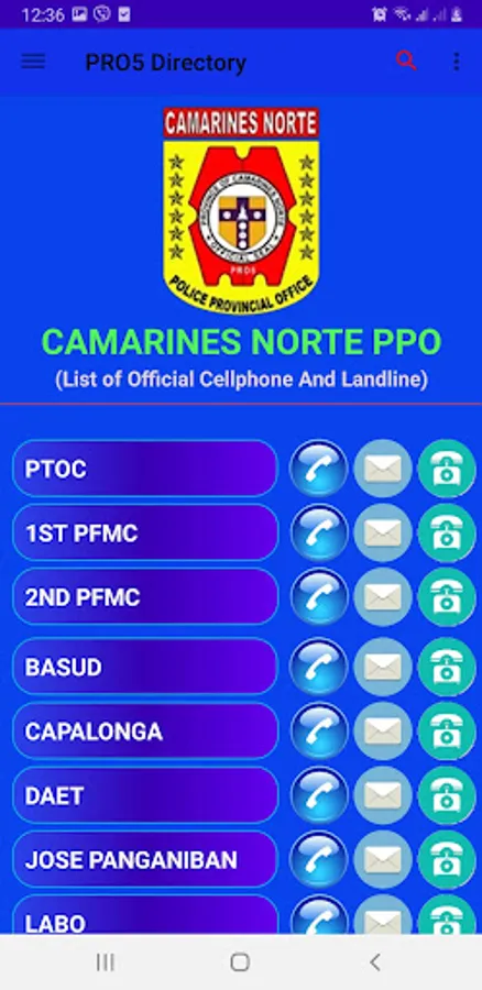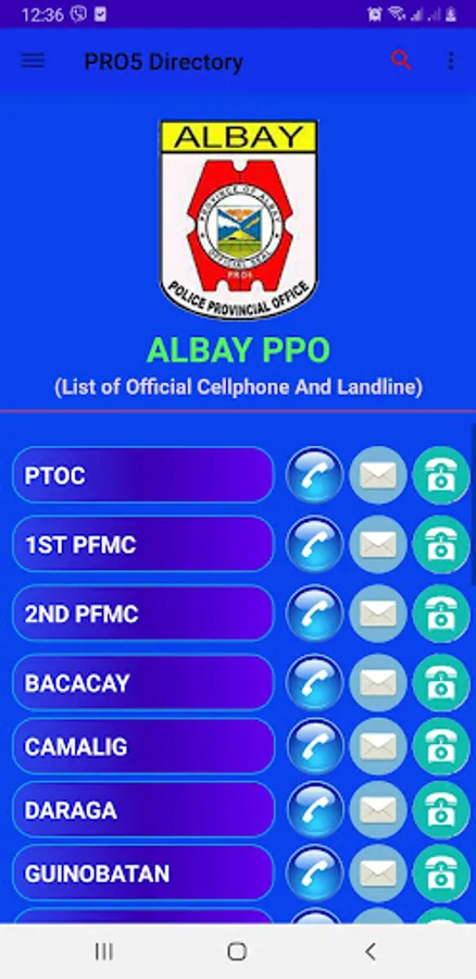 This are the official cellphone and landline of different police stations of Region 5 which are publicly published by the PNP in their website via PDF format. The application can make users ease to call and text all police stations and offices of Region 5 (Bicol Region) in just a clicked. The application has a manual search of different offices and then can be clicked to initiate a call. Likewise, a button is added for the PNP personnel to navigate different PNP website.