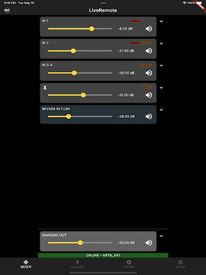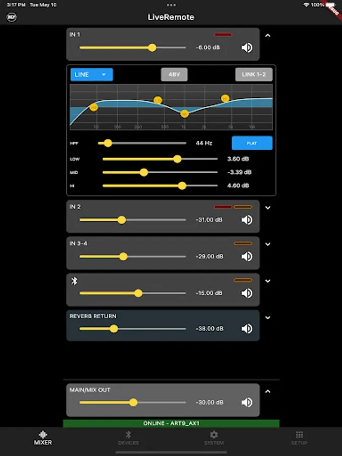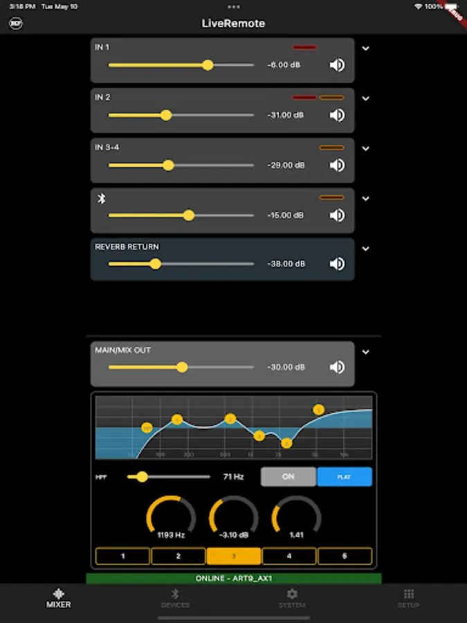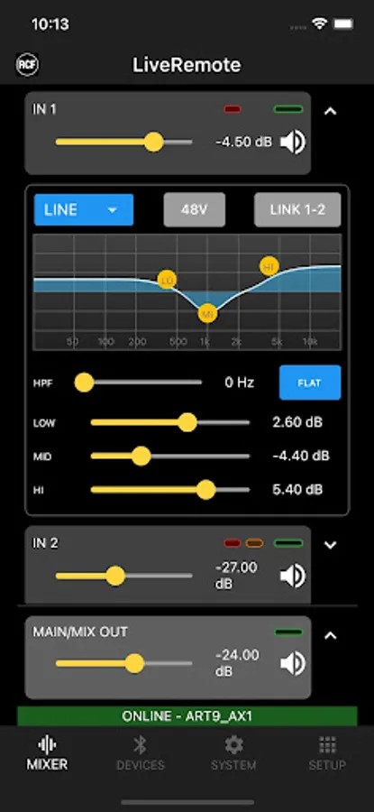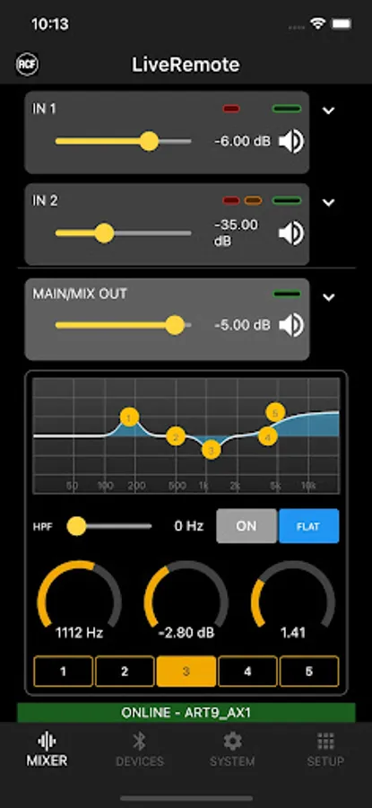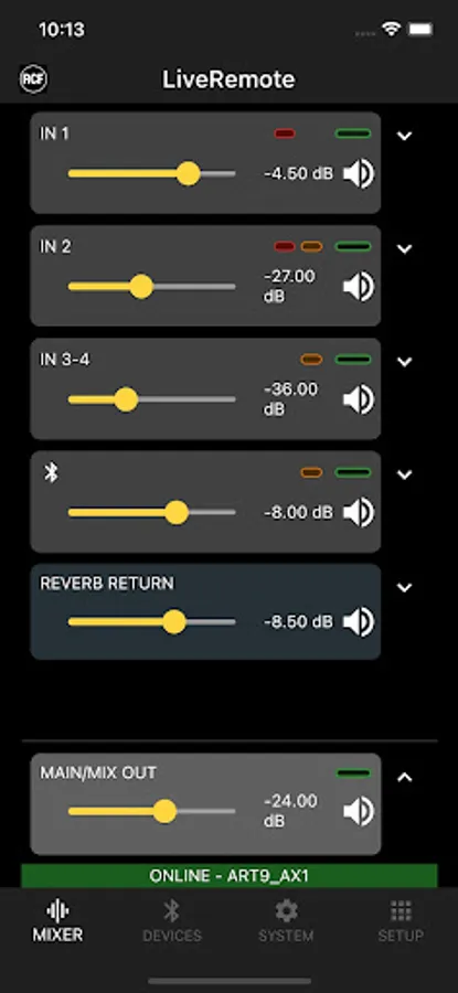 The RCF LiveRemote App allows full control of ART 9 AX active speakers from your smartphone, via Bluetooth. Up to two speakers can be controlled, when in Dual Mode.