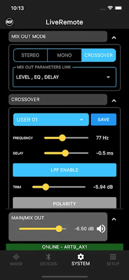 A crossover can be enabled to drive and external subwoofer and several presets are available to perfectly match the ART 9 AX speaker with selected RCF subwoofer models.