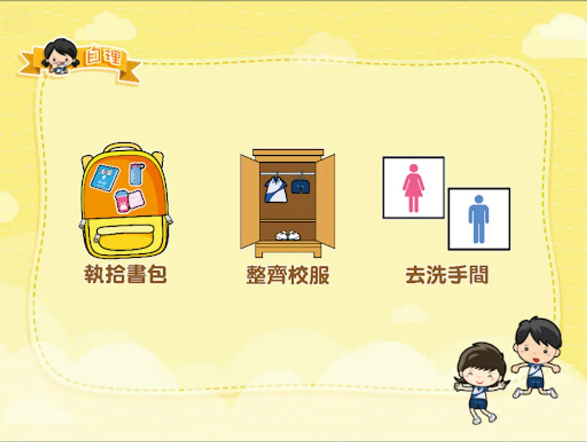 The cultivation of self-care ability is some skill training, so it is necessary to construct concepts with them early. After school children enter elementary school, they have to learn the skills of picking up personal supplies and school bags, and changing school uniforms by themselves. There are three games in this part, namely "Cleaning Schoolbags", "Tidy School Uniforms" and "Going to the Bathroom" to help students construct the above concepts.