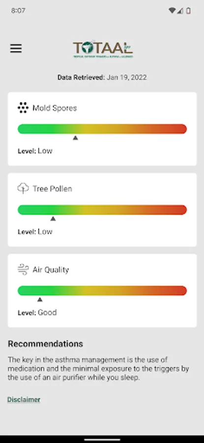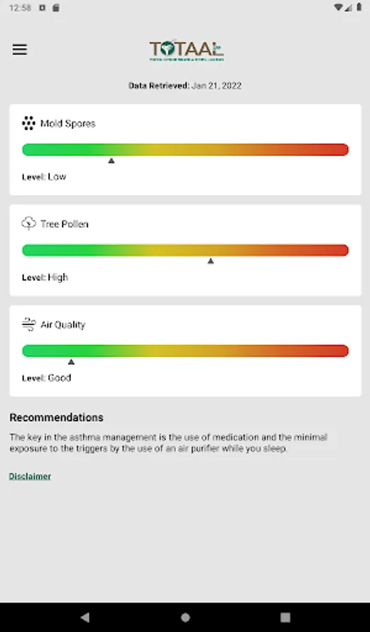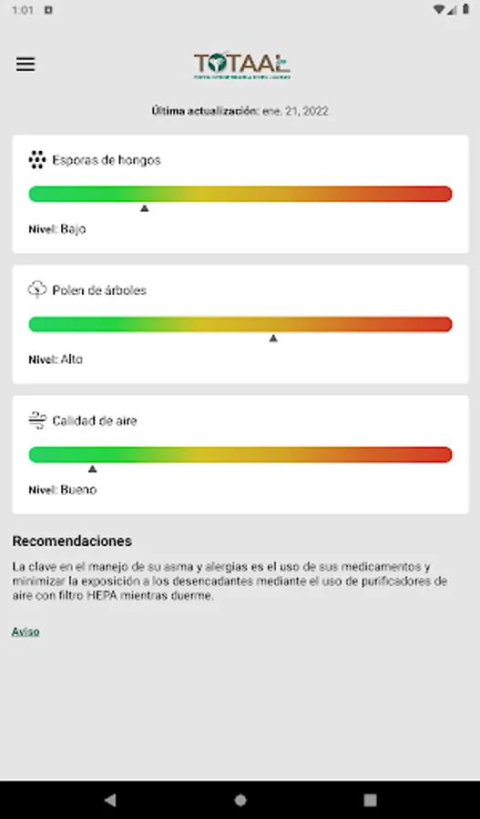 Tropical Outdoor Triggers of Asthma and Allergies (TOTAAL ) application is a free app that provides de levels of pollen and fungal spores for the benefit of allergy sufferers. TOTAAL app is for individual with allergies specifically fungal spores that triggers allergies of the eyes (allergic conjunctivitis), the nose (allergic rhinitis), the skin (atopic dermatitis/eczema and or hives) and those with asthma. This app will help you correlate your allergies and asthma with the local fungal counts.