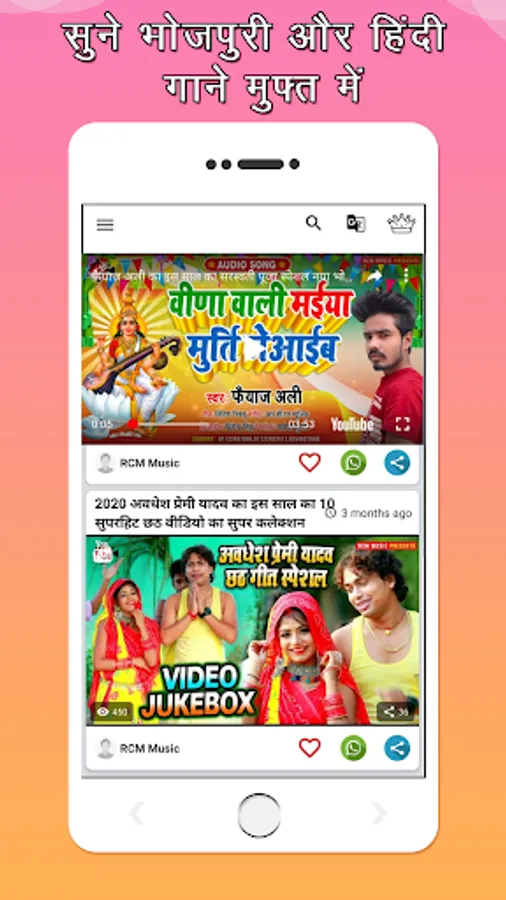 RCM Music app offers entertainment with Bhojpuri Songs, movies, Devi Geet, Bhakti Song videos.