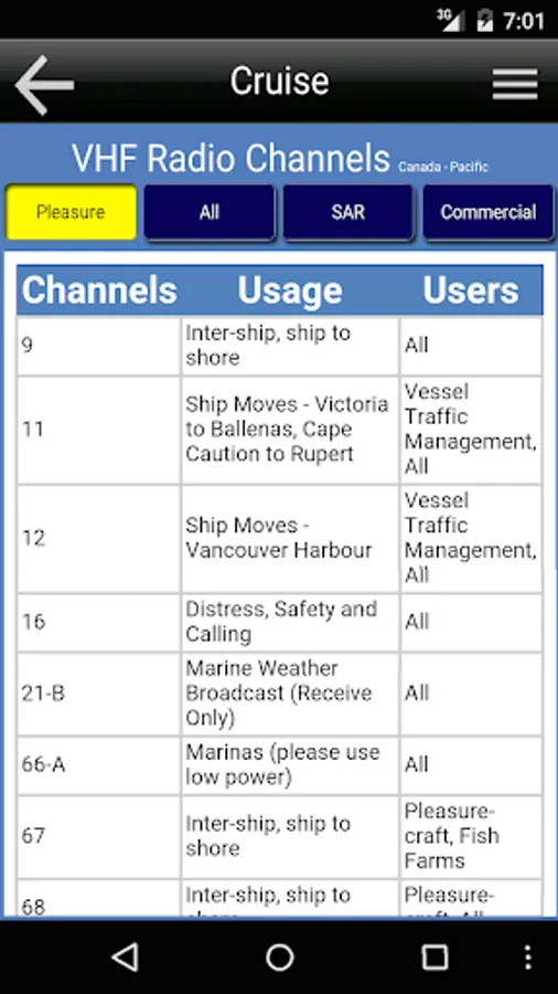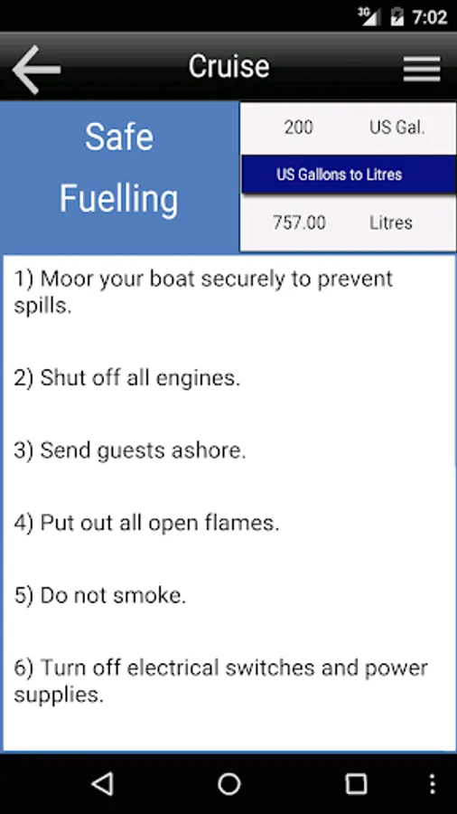 After planning your trip you will need fuel. The cruising section walks you through safe fueling procedures and even includes a fluid volume conversion tool which is particularly useful for visiting boaters. While on the radio it is handy to see the included summary of all the VHF radio channels used locally. Don’t forget to refer to the right of way rules and lateral and cardinal buoy information.