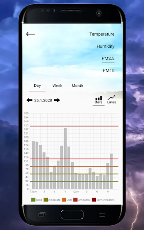 4. Enter the Graph section to see and compare the air pollution and weather conditions from the past day, week or month.