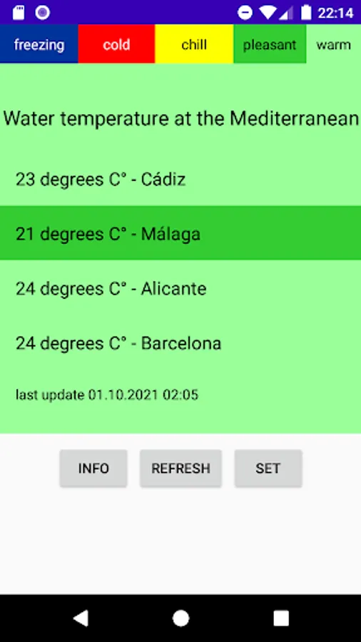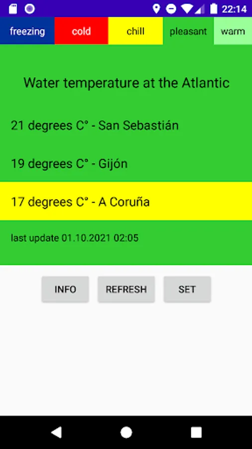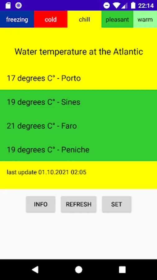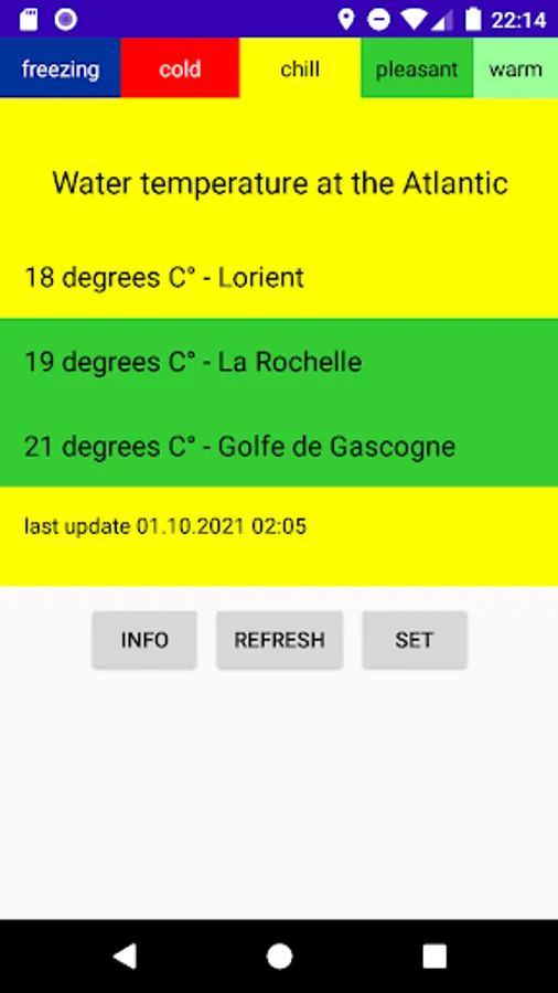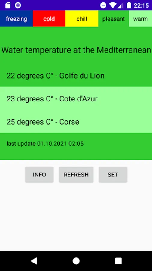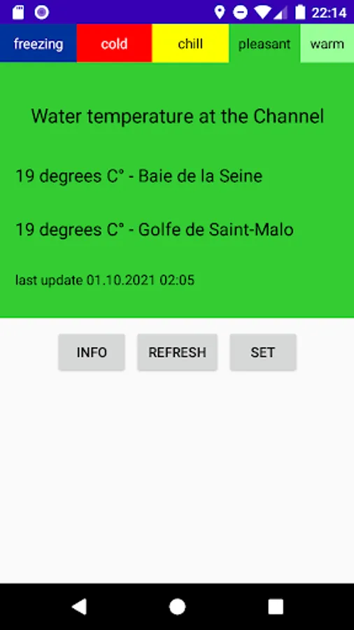 The app delivers daily updated the current water temperature of European oceans and seas. Currently it features the water temperature of of parts of the Channel, the Atlantic and the Mediterranean.