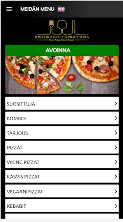 Ristoran Capricciosa ravintola-applikaation käyttöliittymä on helppokäyttöinen ja sen valikko on selkeä sekä