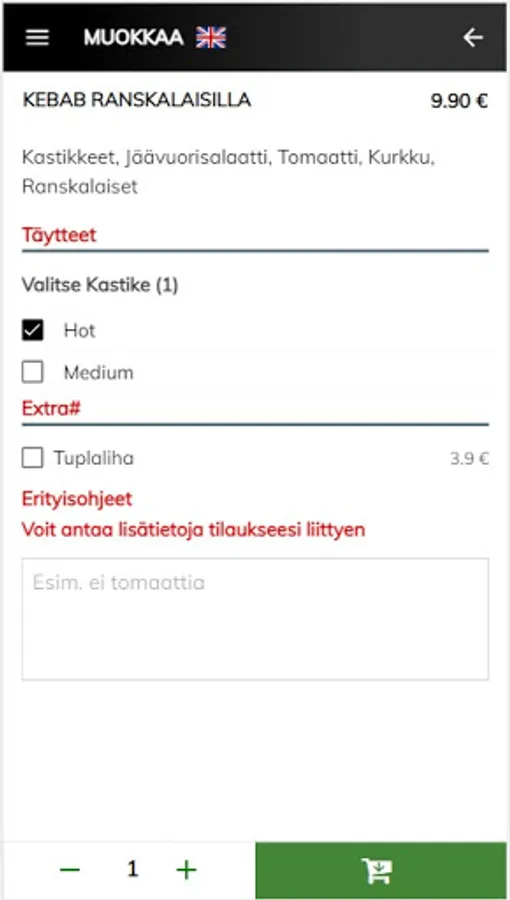 Valittuasi halutun ruoka-annoksen, lisäät sen ostoskoriin – tai valitset esim. lisätäytteitä. Voit tehdä vielä