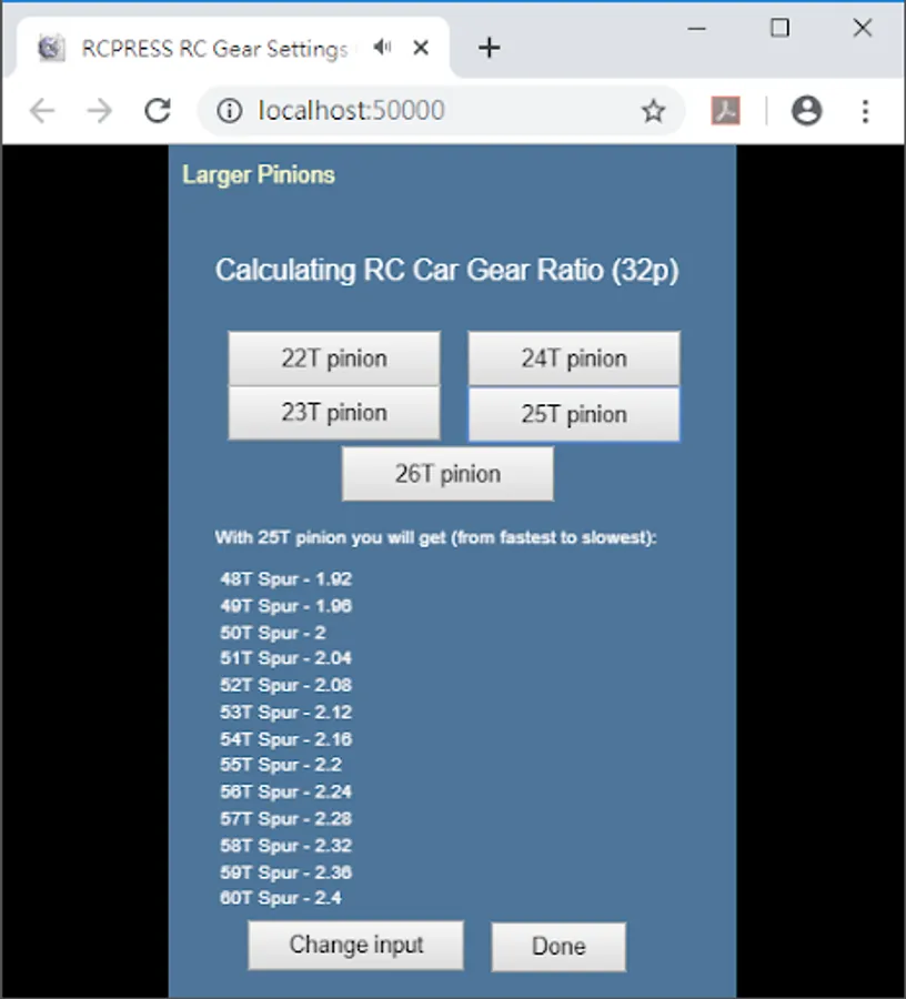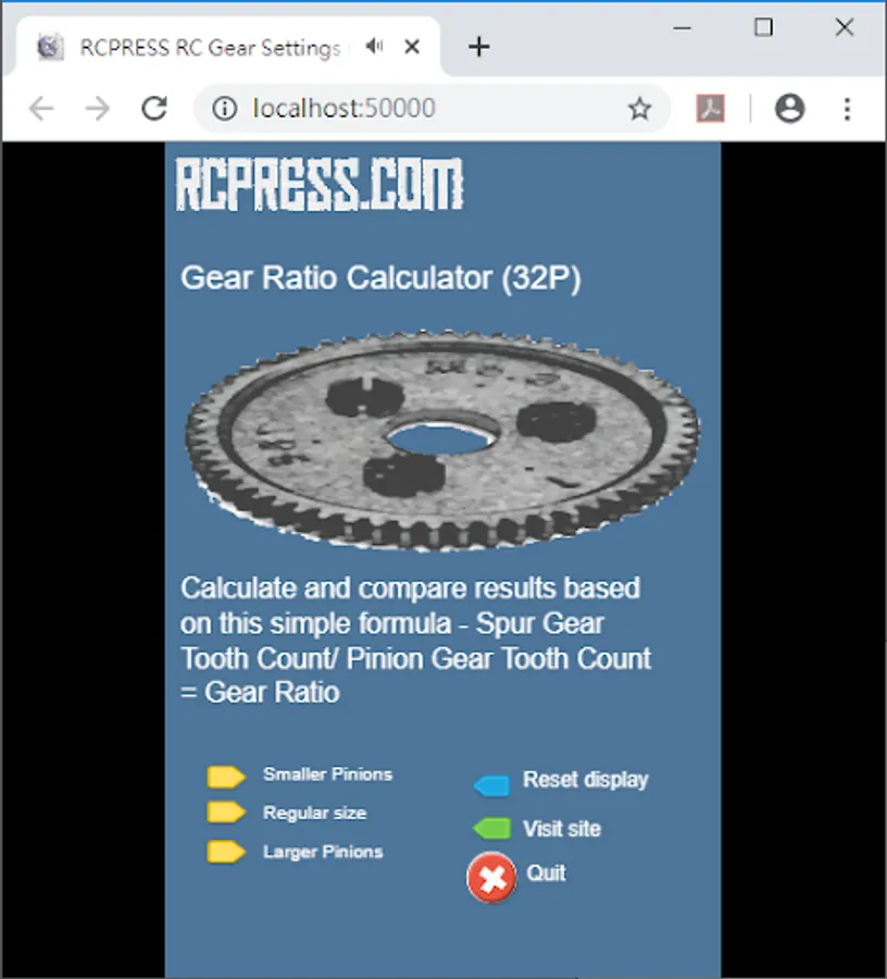 This app quickly calculates ranges of RC car gear ratios for you to compare. This particular version focuses on 32P gears (32p refers to the pitch of each tooth on the pinion gear).