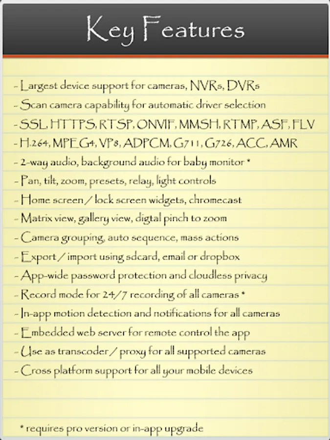 Features include matrix view, pan tilt zoom, home/lock screen widgets, grouping, encryption and in-app motion detection.