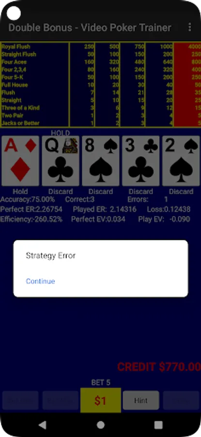 This is the popular Double Bonus video poker game with a strategy analysis engine built-in to help you train to become a better player. After each hand is dealt, the strategy engine calculates all possible outcomes to determine the best cards to hold to get the highest payoff. You can click 'Hint' to view the results or you can play without hints. If you did not hold the optimal cards, a popup message will inform you of the error and you will see which cards were optimal. Click 'Pay' to show a payout odds table of all possible hands. Statistics on the number of errors you make will be tracked as you improve your play.